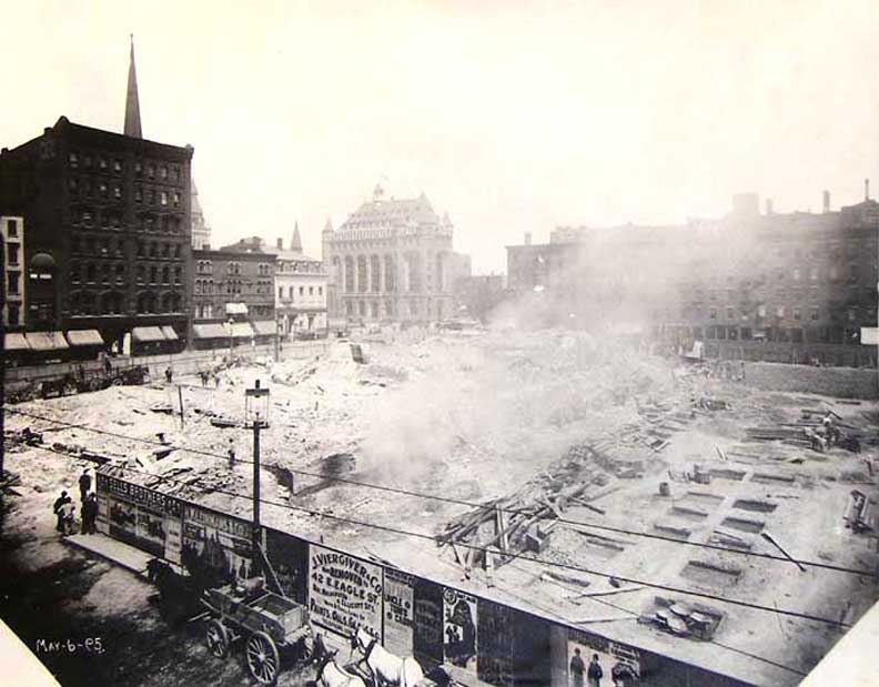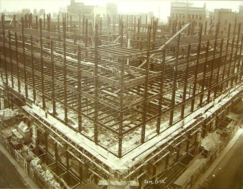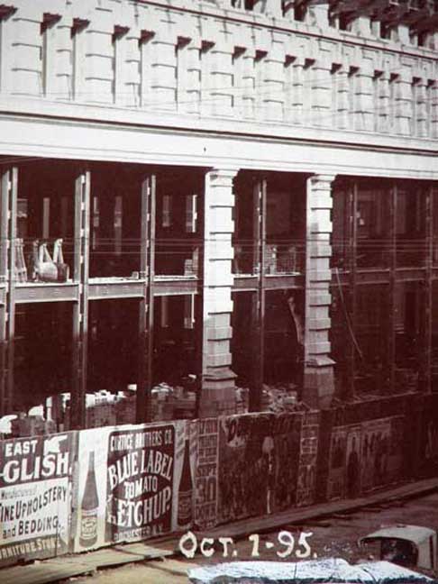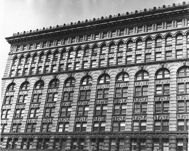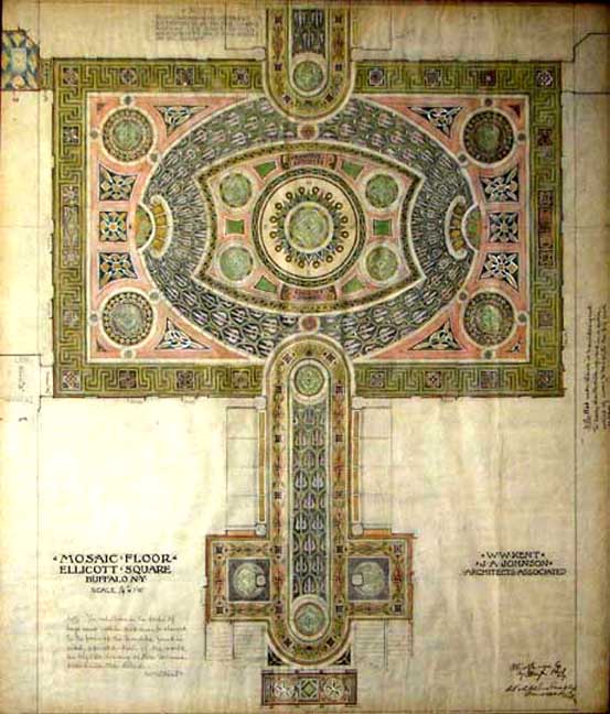 Main Street, extending from Swan Street to Eagle Street. Subsequently, for about 100 years, his heirs and their successors retained title to that part of the property between Swan Street and South Division Street, extending from Main Street to Washington Street. This area has therefore been known, and is still known, as "Ellicott Square." See Ellicott Square Block for six photos of the buildings that were located on the block prior to the Ellicott Square Building. In 1895, the Ellicott Company commissioned architect Daniel H. Burnham of Chicago to design what they referred to as an "office block" in downtown Buffalo. The result was a building occupying the entire space between Main, South Division, Washington, and Swan Streets. Its 10 stories, 60 offices, and 40 stores, along with its central court, made it the world's largest office structure of its time, at a cost of 3.5 million dollars. It was on May 30, 1896, only one year following its inception, that the Ellicott Square Building -- the largest, finest, and most complete office building in America -- took its place as a finished structure in the front rank of the notable features of the city of Buffalo. Like Burnham and Root's Rookery in Chicago, it is constructed around a large interior court. The elaborate terra-cotta exterior, now painted gray, which in its essential lines follows Richardson's Marshall Field Wholesale Store in Chicago, was conceived by Charles B. Atwood (1849 - 1895), the designer-in-chief of the World's Columbian Exposition and master of "all artistic matters" in the Chicago-based firm of D. H. Burnham and Company. The architecture of Ellicott Square may be termed "Italian Renaissance," with refined and classic ornamental features. To the top of the second story, the outer walls consist of granite, iron, and terra-cotta , with a veneer of pearl-gray brick and terra cotta trimmings above -- the whole being adequately crowned with a cornice of massive proportions and great beauty (removed in the 1970s). The effect was to reproduce the quiet dignity, repose, and impressive grandeur of the great palaces of Rome and Florence. Sources: