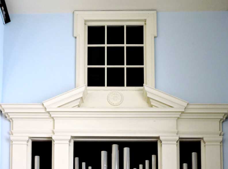 Eared window atop organ pipes with Tuscan surround, including broken pediment