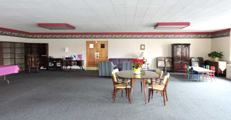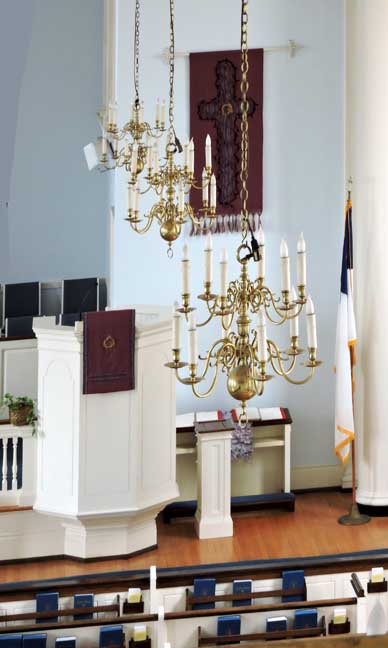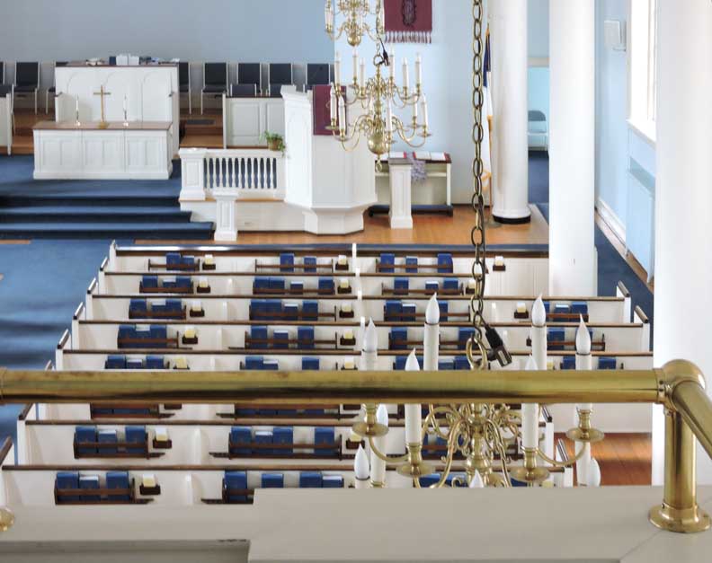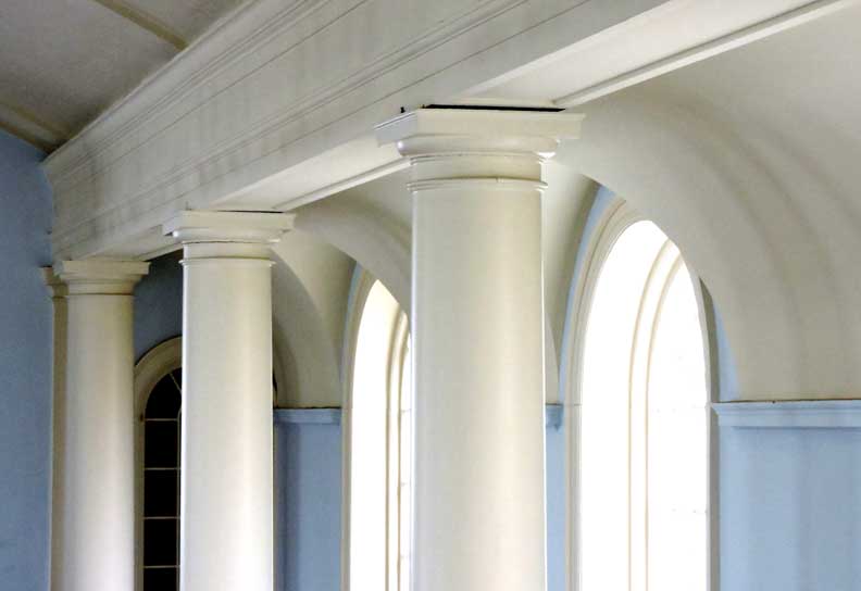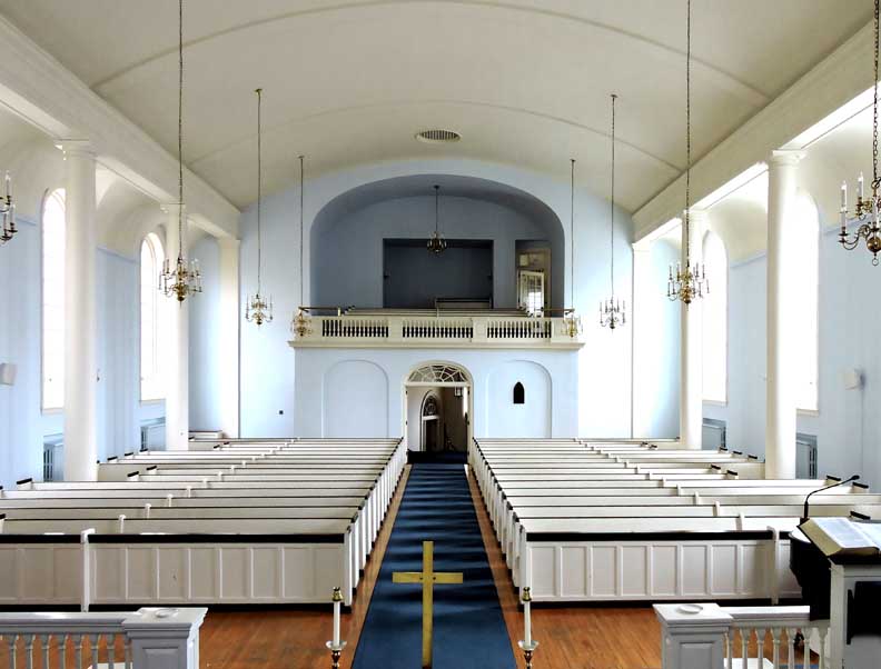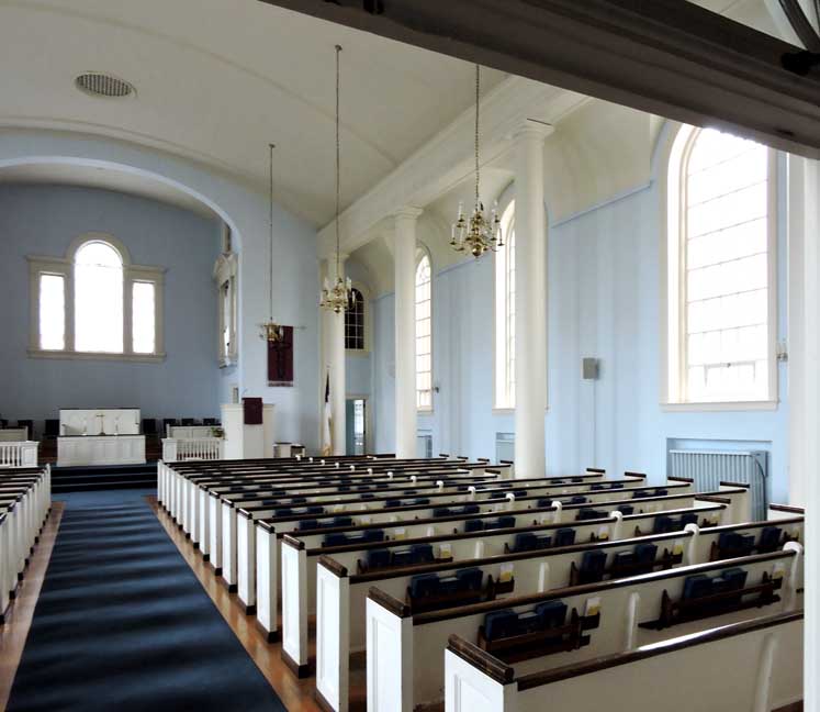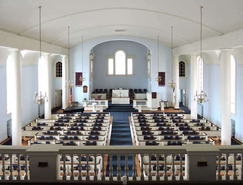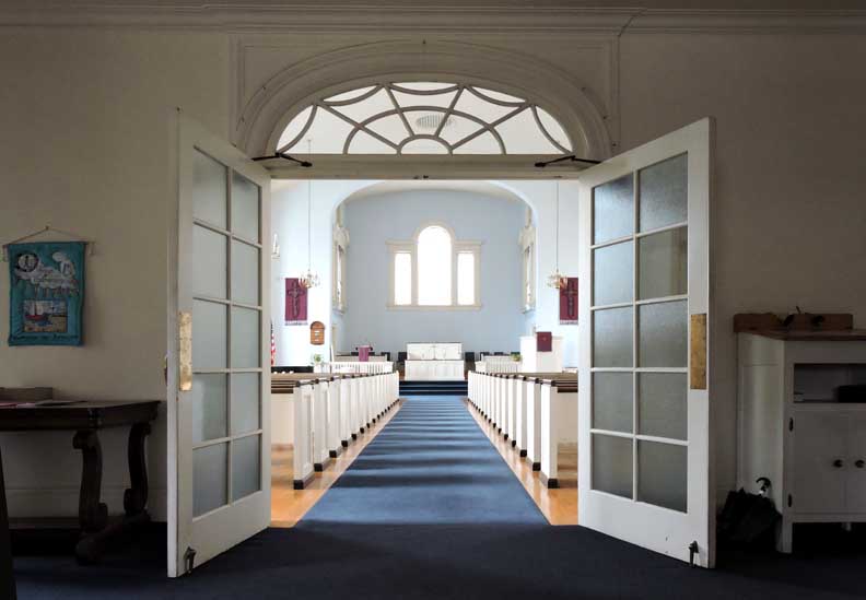 The entrance into the nave of the sanctuary is from the narthex through paired French swing doors beneath a fanlight transom window with spider web muntins