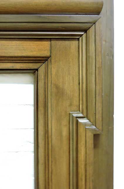 Right side of photo: Rectangular transom window over the vestibule entrance double doors (detailed in photo below:)