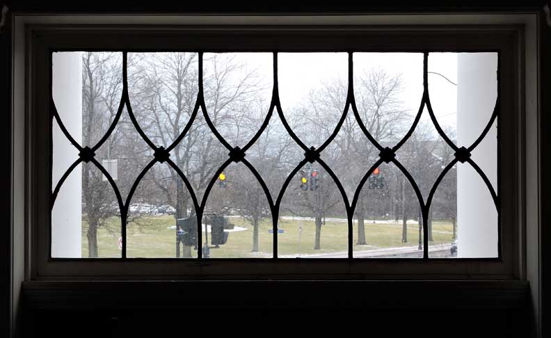 Rectangular transom window looking onto Main Street and UB