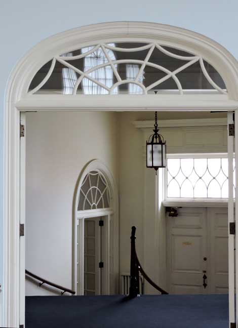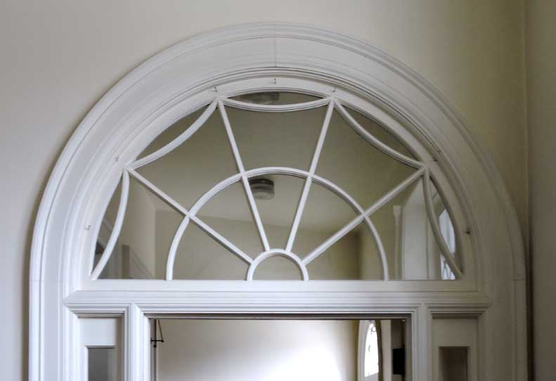 Top of photo: Fanlight transom window with spider web muntins.
