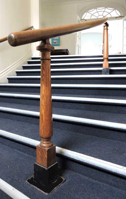 Vestibule staircase oak newel post ... Quite different from typical Colonial Revival staircases