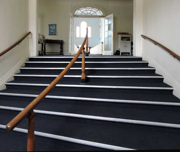 Vestibule staircase leading up to narthex hallway ...
