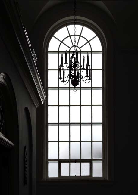 Middle of photo: Semicircular transom window with spider web muntins.
