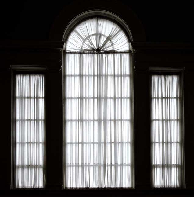 Palladian window covered with sheer curtains