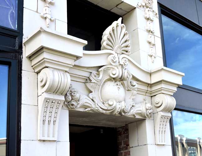 2015 Photos Main entrance ![]() ![]() Spiderweb muntins in leaded glass: Ornate lead-lined window over the main entrance was uncovered and restored by the Avalon Development Co. in the 2009 restoration ... Details below: ![]() Bow knot ribbon ... Spiderweb muntins ![]() ![]() |