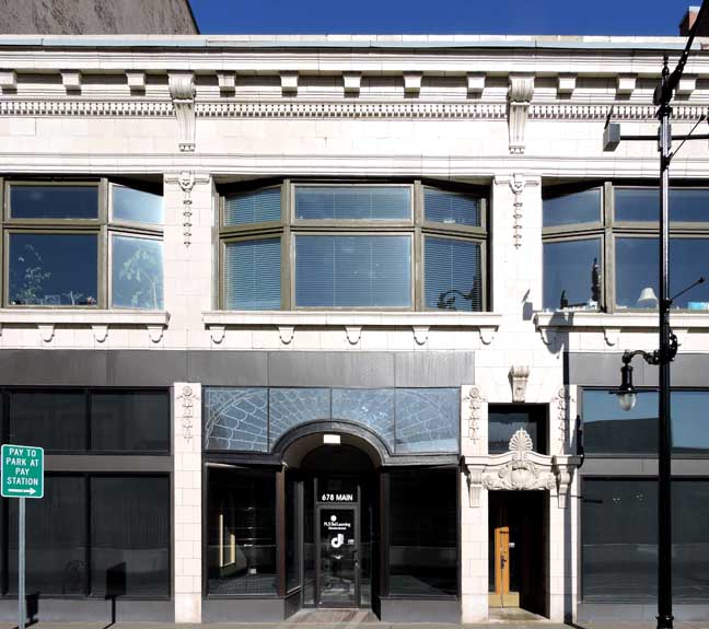 2015 Photos![]() ![]() Three Beaux Arts style buildings, all featuring white glazed terra cotta ![]() Neighbors south: Tent City ... Greyhound Bus Terminal/Alleyway Theater ![]() Northern neighbor: 686 Main Street, commonly referred to as the Birzon Building, was constructed in 1901 by George N. Pierce Company ... 678 and 686 will be connected on the second floor after renovation of the Birzon Building in 2015 ![]() Left and center bays ![]() White glazed terra cotta ... Egg-and-dart molding ... Block modillions ... Dentil molding ![]() Terra cotta: Cornice ... Block modillions ... Dentil molding ![]() Block modillions ... Beaux Arts stylized ancone ... Dentil molding ![]() Cornice ... Beaux Arts stylized ancone ... Block modillion ... Dentil molding .... Pendant bellflowers |