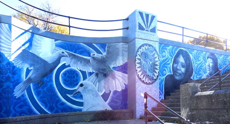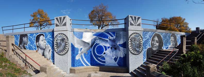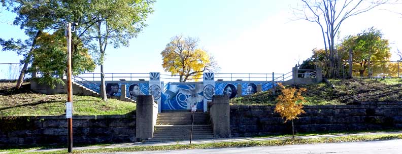 By Queenseyes Buffalo Rising, November 10, 2015 ( online Nov. 2018) The final artistic components have been applied to the highly anticipated Masten Park mural called “Ray of Light”. The glass mosaics created by McElf GlassWorks now grace the Masten Avenue entranceway to the park. The mosaics were created in tandem with a mural painted by artist Augustina Droze. The public work of art was commissioned to honor the life of of Jerald (Dee Dee) Goldsmith, the mother of seven who was found murdered in Masten Park last October. Ever since this work of art started, I have found myself taking my dog to Masten Park to get some exercise. It's a great park that has a ton of potential. First of all, it's located directly across from the Masten Avenue Armory and just down from City Honors School. Second, it's got a ton of amenities that include a splash pad, a playground, a pool, a jogging track, changing rooms, four basketball courts, and a softball diamond. Thirdly, it bounds the Johnnie B. Wiley Amateur Athletic Sports Pavilion. The park has needs though. As much as it initially appears to be in pretty good shape, there are some easy fixes that should be conducted right away. Some of the park benches are broken, which is a sign of neglect. I didn't see any bike racks, which is unfortunate. Also, there is a super dated and faded mural that could use a redo. The Ray of Light Mural is a great first step towards adding life and vibrancy to this park. Getting to this park from Elmwood/Allentown area is easy breezy. Each time that I have paid a visit in recent weeks, I have found the grounds relatively unfrequented. There's so much potential, which unfortunately took a tragedy to realize. Last evening my wife accompanied me on my regular jaunt to the park. After playing around with our dog for a while she exclaimed that there was something very special about the park, and wanted to come back again the next time I was planning an outing. She loved the mural, the elevated park setting, and a gated area (on three sides) towards the back of the park where our dog could run freely without having to worry about cars. A park is what you make of it. In the case of Masten Park, there is limitless potential to continue on with these initial artistic efforts that have already provided one family with a newfound affinity for a relatively unfamiliar public park setting. |