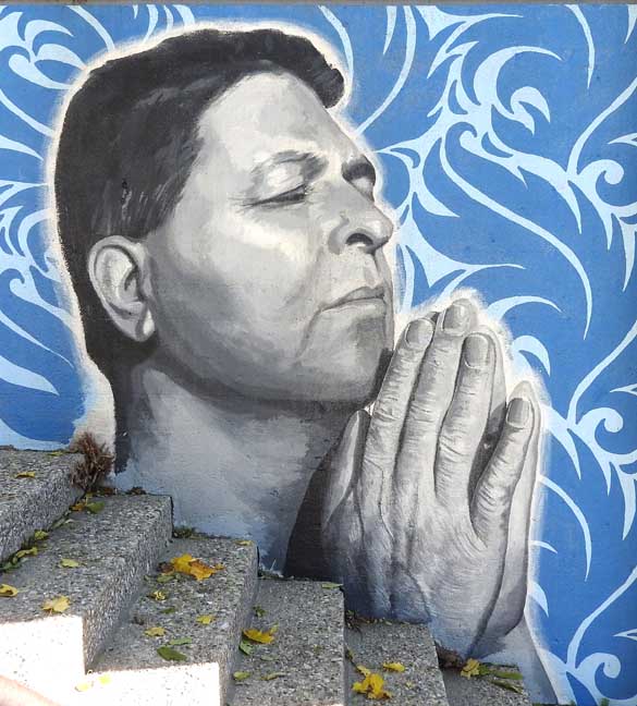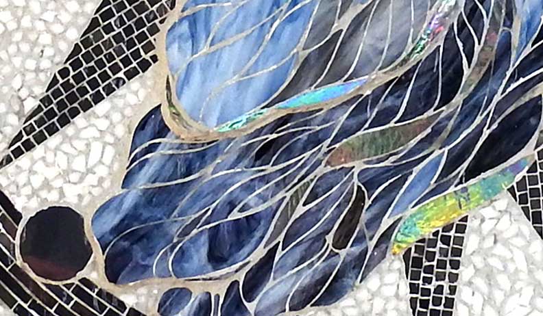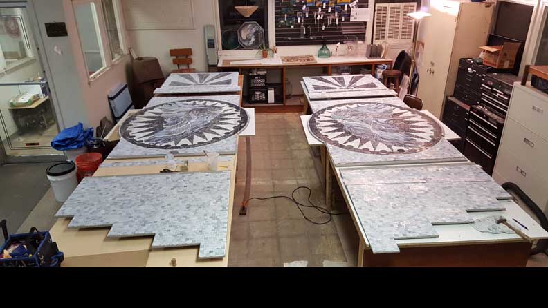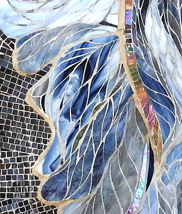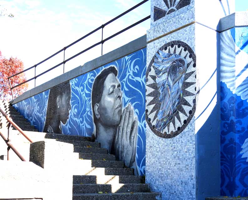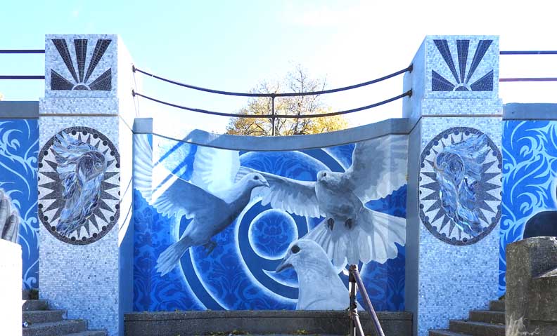 2018 photos![]() Details below, from left to right: ![]() Mural and glass mosaic column ![]() Mural detail ![]() ![]() ![]() Dove imagery in the center of the mural is reinforced by flanking glass mosaic columns that also, in part, depict doves. See Megan McElf's description of the columns below. Left glass column is detailed below: ![]() Left glass mosaic column capital: sunburst ... Column background consists of 8,500 1” tiles, all hand-cut from large sheets of glass ![]() Left glass mosaic column medallion ... "The