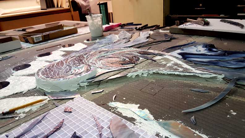 concrete, and more caffeine than could possibly be tracked. The columns are built from 14 individual panels, put together like a puzzle on site. Almost 20,000 pieces were created and used to create the project. The background alone is comprised of 8,500 1” tiles, all hand-cut from large sheets of glass. ![]() ![]() |