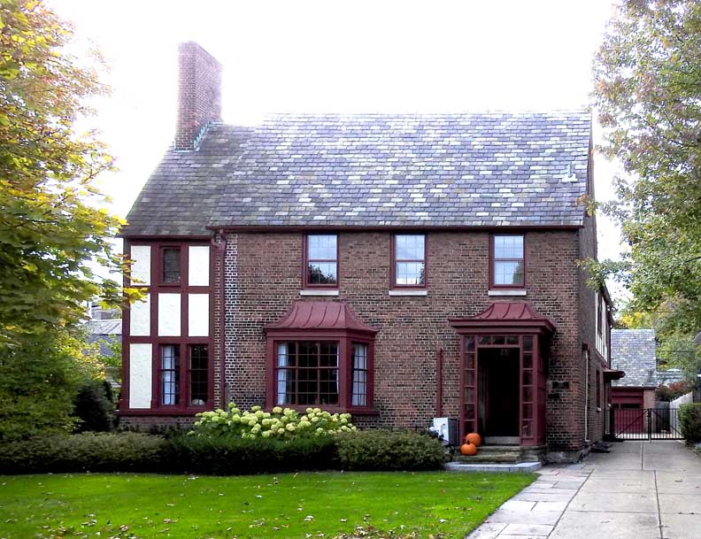Facade ![]() Tudor Revival style Details below, starting at the top: ![]() Slate roof ![]() Tie rod anchor ![]() Living room bay window ![]() English bond brick pattern ![]() ![]() Tudor Revival plank door with bull's eye glass (detailed below:) ![]() Leaded bull's eye glass ![]() |