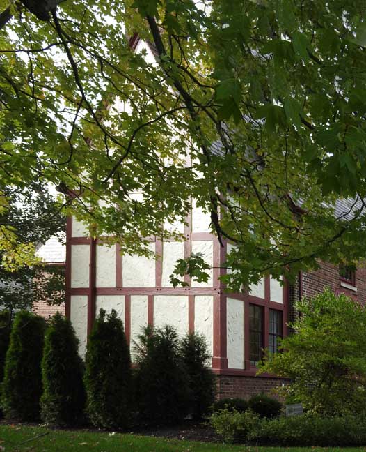 west elevations![]() East elevation Tudor Revival half-timbering ![]() West elevation ![]() Tudor Revival diamond bond using dark header bricks ![]() An earlier door |