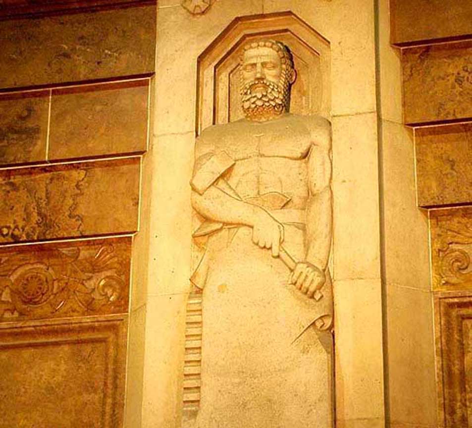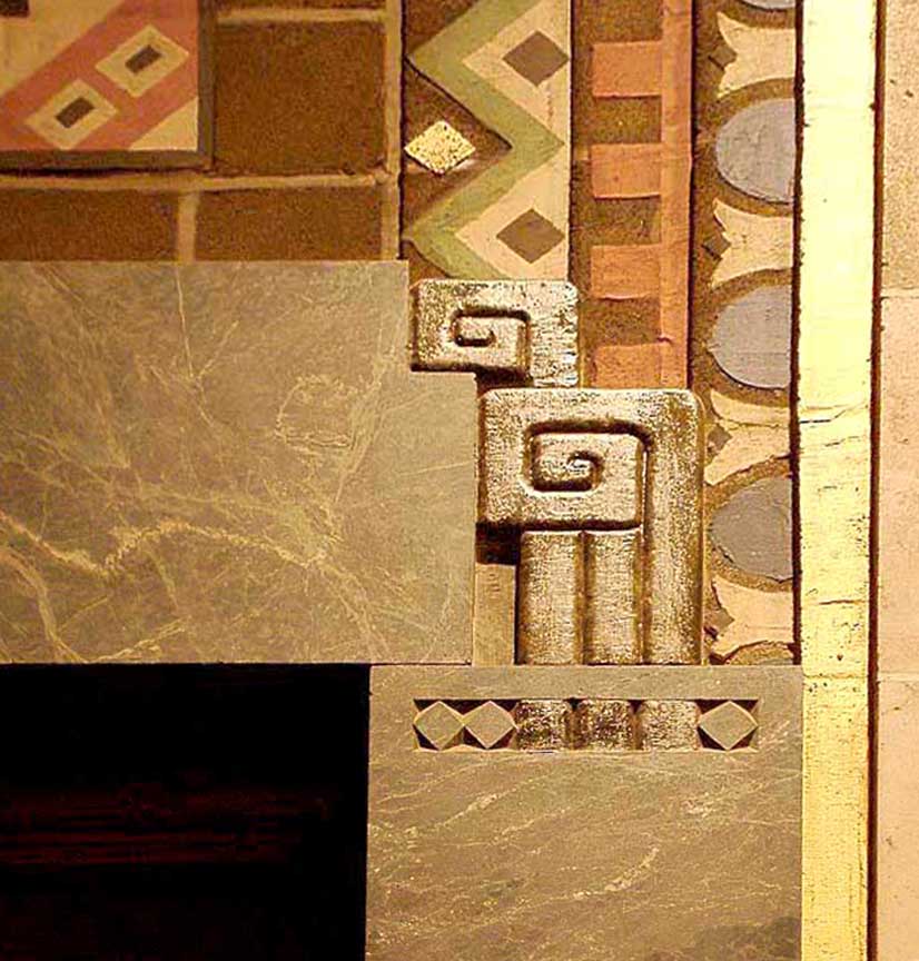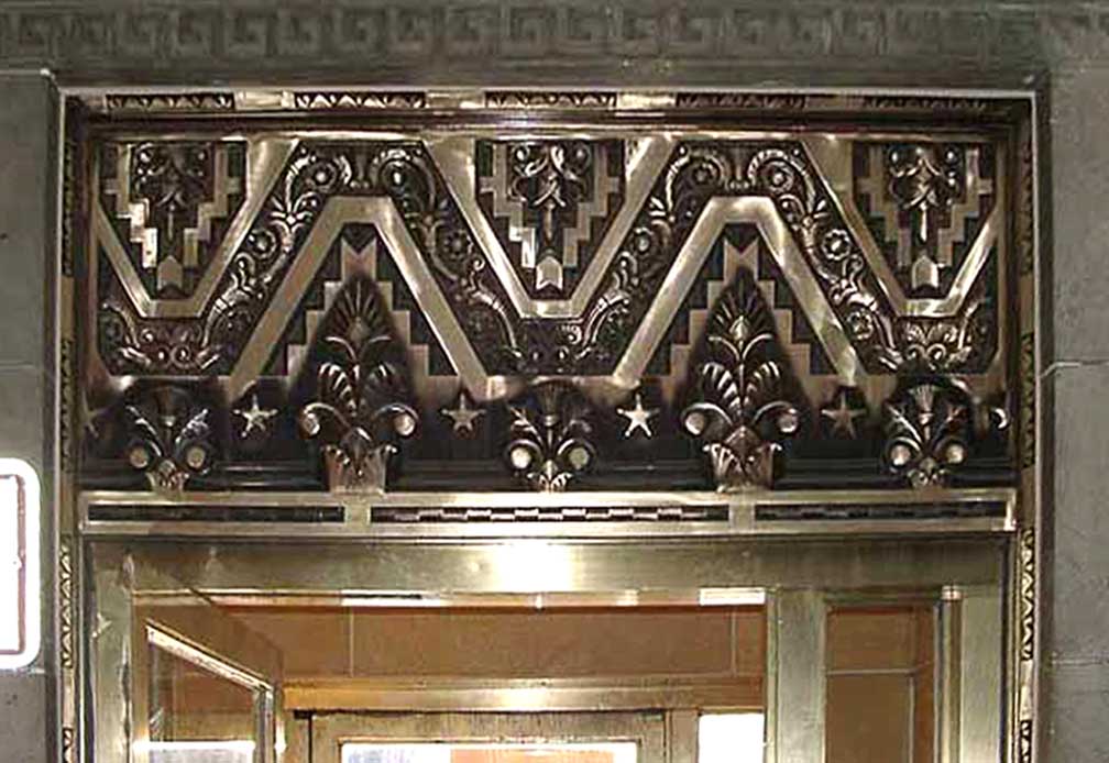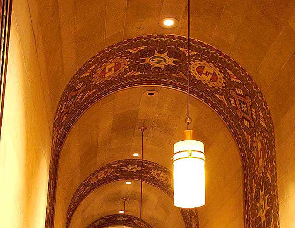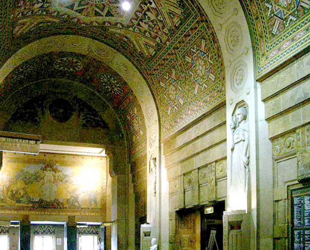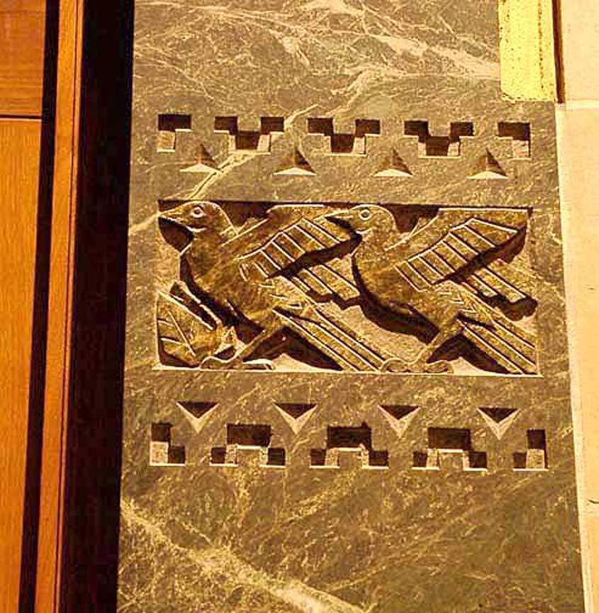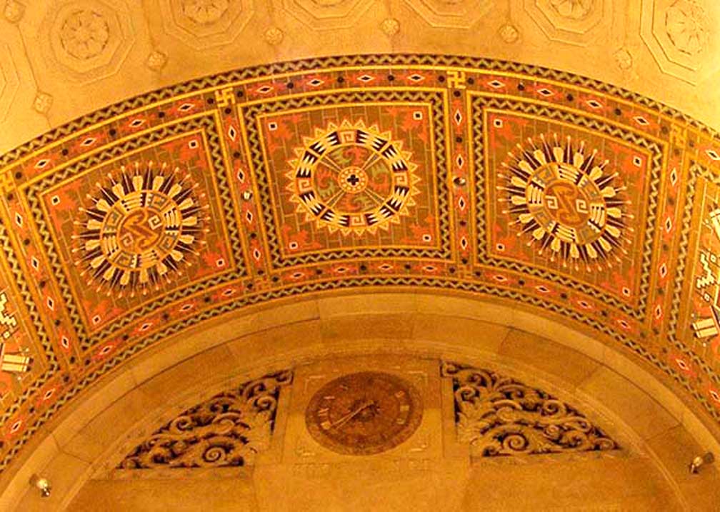 ![]() Vestibule bronze transom is identical in design to exterior transoms ![]() Entering the building from the high-ceilinged portico, one passes through a low vestibule in preparafion for entrance to the dramatic vaulted space of the central lobby. Under the three- story-high barrel vault, every surface is ornamented with rich materials and fine craftsmanship. An air of solemnity, even mystery, is sensed. ... Each of the square floor files is locked to the adjacent tile with an inlaid brass butterfly. ... The floor around the panels is figured green carcluth marble. The green marble also forms a continuous baseboard around the entire lobby. ![]() Reeded pilasters of green carduth marble ![]() The corridors are two-story-high vaults forming, at their termination, a semi-circular wall at the second story level. ![]() ![]() ![]() ![]() ![]() ![]() ![]() ![]() ![]() The front and rear end walls of the lobby at the second floor level, display large richly colored mural paintings by William de Leftwich Dodge, a New York City artist. appear to be held aloft by two green marble pillars, as though on an easel, The painting at the rear, facing the entrance, is titled "Talents Diversified Find Vent in Myriad Form." William de Leftwich Dodge studied in the late 19th century in Europe, notably with the French academic painter, Jean Leon Gerome. Dodge's murals won many awards in late 19th century international expositions and received praise in numerous installations in Boston, New York, and Washington, DC. His mural "Ambition" in the Library of Congress is well known. Other mural work is in respected New York hotels, among them the Astor, Algonquin, Devon, and Waldorf Astoria, in the Majestic Theater in Boston, Esquire Theater in New York, Academy of Music in Brooklyn, and Orpheum Theater in Kansas City. ![]() Seated in the center is a heroic female figure of Buffalo, haloed in a sunburst. She is holding forth festoons of golden fruit. ![]() Detail ![]() The mural represents the industries of Buffalo at which her citizens work. ... Grain storage, agriculture, water commerce, steel making, construction, and transportation are all represented. ![]() ![]() Larger-than-life-size solemn figures, two male, two female. They are allegorical representations of character traits that are expected of the public servant, namely: VIRTUE, DILIGENCE, FIDELITY, and SERVICE. The four centrally located figures were sculpted by Albert T. Stewart, the sculptor of the exterior friezes. From the shoulders downward, the sculpted lines become less distinct and completely dissolve at their base. ![]() Figures stand against a light stone pier, in a shallow niche. The stone pier rises to become a band of stone arching over the surface of the vault, united to the opposite pier, as one continuous element. The two arches divide the vault into three areas of painted acoustic tiles. ![]() The system of interlocking "Akoustolith" tiles forming a continuous curved vault surface was installed by the Raphael Guastavino Co. of New York City. ... There are thousands of individual tiles in the vaults. The tiles are decorated with painted panels of designs derived from Native American signs and symbols. ... The center of the larger middle area has an octagon containing feathers outlined in gold, representing a Native American headdress. ... See ceiling by Gustavino Co. in St. Francis de Sales Church. ![]() ![]() ![]() Captions sources: