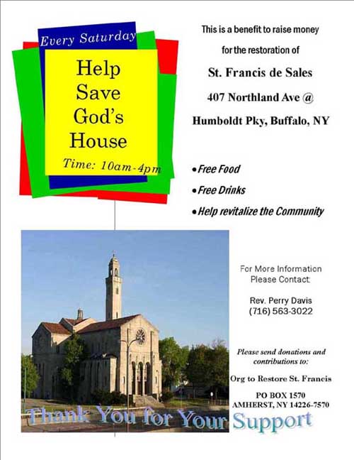 The owner of the church, the Roman Catholic Diocese of Buffalo, closed this church, as well as others in Buffalo, in 1993. Standard procedure for closings is to remove objects that are specific to Roman Catholicism. The church was sold and between 1993 and 2003, the church was stripped.In 2003, Rev. Perry Davis is purchasing the church. See flyer for further information. Photos on this page were taken in October 2003 with permission from Rev. Davis.