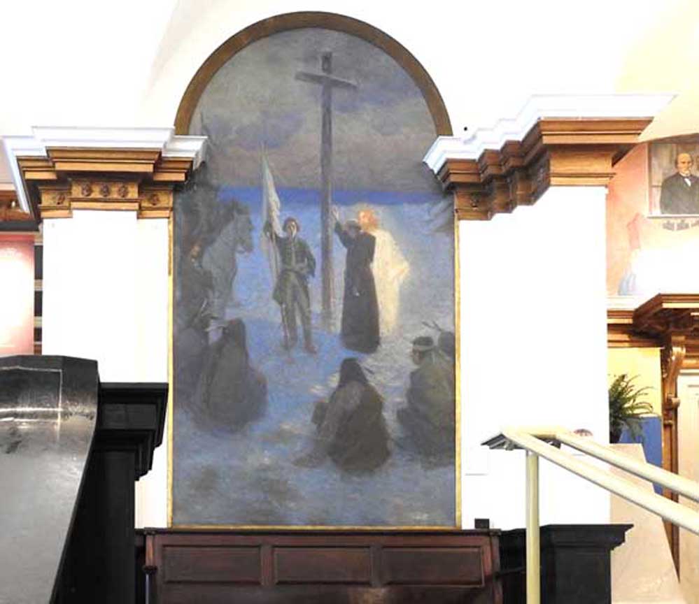 photos Second floor Galleries ![]() Seneca Nation Gallery ... Notice Oliver Perry mural at the end of the hall (3 details below:) ![]() Mural detail #1 " Perry's Visit to the Navy Yard at Scajaquada, overhead mural painted by Angelo Charles Scibetta. 1930's Works Project Administration (WPA) project. The artist is depicting the Seneca orator Red Jacket addressing Commodore Oliver Hazard Perry and his officers during the War of 1812. Oil on canvas, 6'5"x21', 1940, WPA/FAP." - Buffalo History Museum (online Jan. 2019) ![]() Perry's Visit mural detail #2 ![]() Perry's Visit mural detail #3 - Seneca orator Red Jacket addressing Commodore Oliver Hazard Perry ![]() Marble molding around the entrance to the Tim Russert Gallery ... Ancone-supported entablature (two details below:) ![]() Alternating rosettes and modillions ![]() Acanthus leaves decorate modillions ![]() Part of the permanent Tim Russert Gallery display ![]() Important map of the Buffalo waterfront and more ... See also details ![]() Gallery ceiling detail: egg-and-dart molding ![]() Gallery ceiling detail: Laurel leaf motif Return to top |