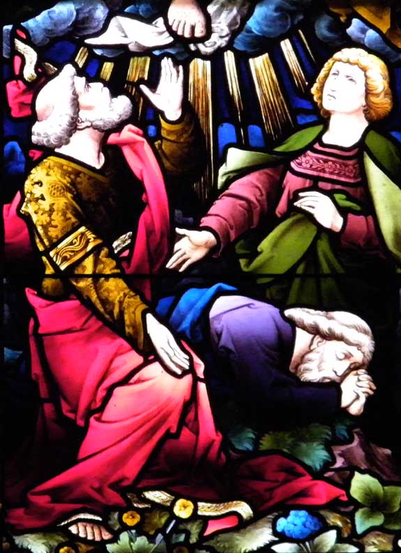 The Transfiguration of Christ Peter, James and John. Mark 9:2-4: 2 And after six days Jesus taketh with him Peter, and James, and John, and leadeth them up into an high mountain apart by themselves: and he was transfigured before them. Iconography in Art and Architecture: Transfiguration LARGER SIZE beneath top photo |