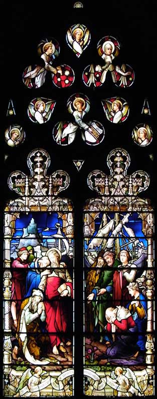 | St. Paul's Farewell to The Elders of Ephesus at Miletus Designed by John Hardman & Co. of London, England Installed 1889 Memorial to Lucretia Stanley Shelton (1798-1882), the wife of Rev. William Shelton, Rector of St. Paul's (1829-1881). The scene is described in Acts 20:13-27 20:36 When he had said this, he knelt down with all of them and prayed. 20:37 They all wept as they embraced him and kissed him." Iconography in Art and Architecture: St. Paul LARGER SIZE beneath top photo |
