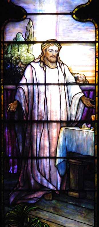 | Supper at Emmaus - Detail Supper at Emmaus (Pronounced: ee MAY is) Designed by Mr. Brink of Tiffany & Co. Installed in 1932 at a cost of $7,500 (2008 dollars: $118,211) Bible: According to Luke 24:13-27, the risen Jesus appeared to two disciples who were walking from Jerusalem to Emmaus, which is described as being 60 stadia from Jerusalem. Luke places the story on the evening of the day of Jesus' resurrection. LARGER SIZE beneath top photo |