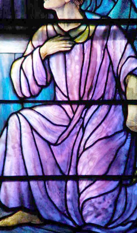 | Supper at Emmaus - Detail Supper at Emmaus (Pronounced: ee MAY is) Designed by Mr. Brink of Tiffany & Co. Installed in 1932 at a cost of $7,500 (2008 dollars: $118,211) Bible: According to Luke 24:13-27, the risen Jesus appeared to two disciples who were walking from Jerusalem to Emmaus, which is described as being 60 stadia from Jerusalem. Luke places the story on the evening of the day of Jesus' resurrection. LARGER SIZE beneath top photo |