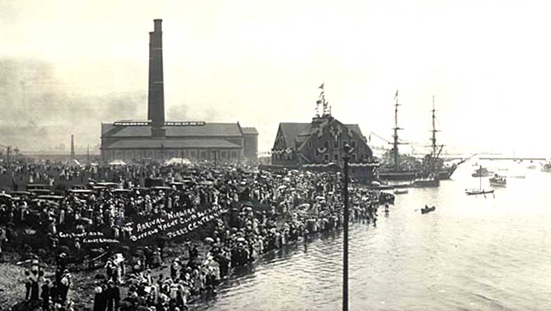 ![]() 1912 Perry Centennial "The smoke stacks are the Ward Pumping Station and the tall ship near the Buffalo Yacht Club is the brig Niagara, the flagship of Oliver Hazard Perry's fleet. Niagara is in perfect condition and is located in Erie, PA." -- Matthew Bova ![]() Detail |