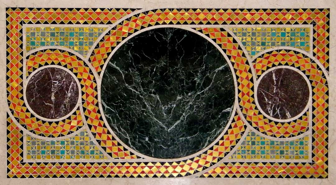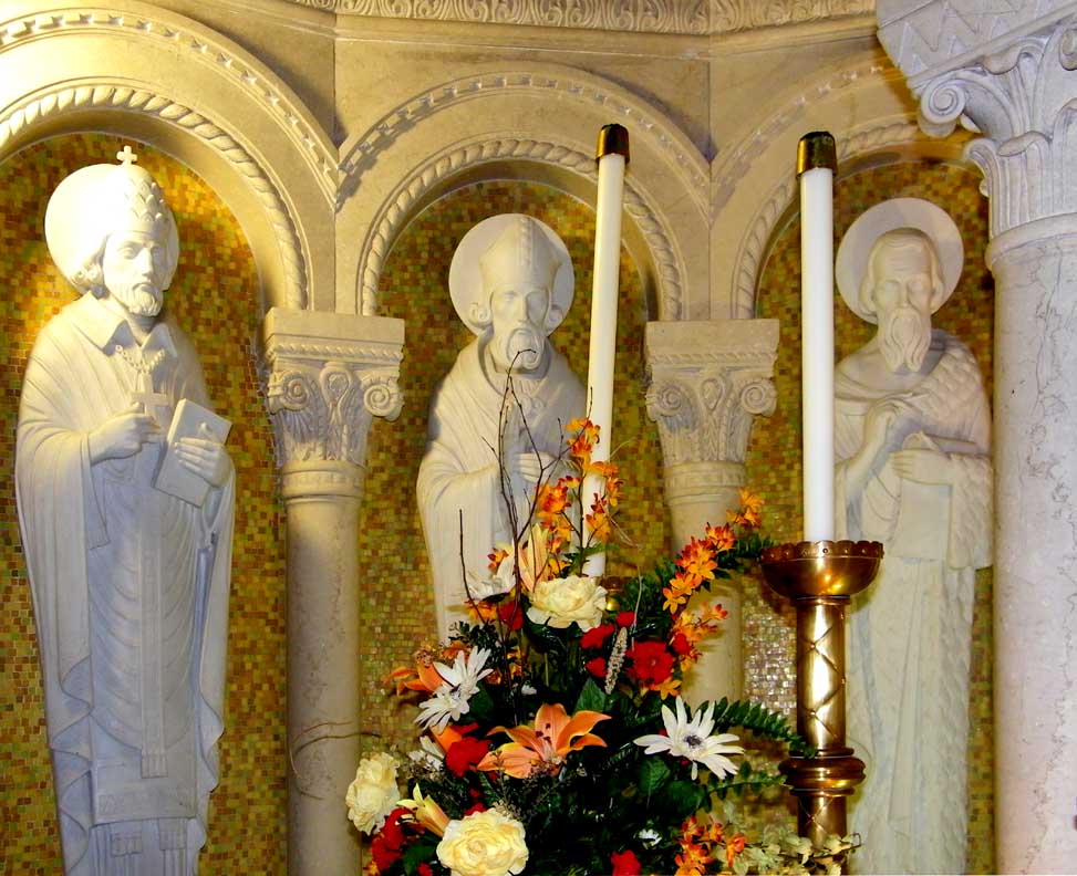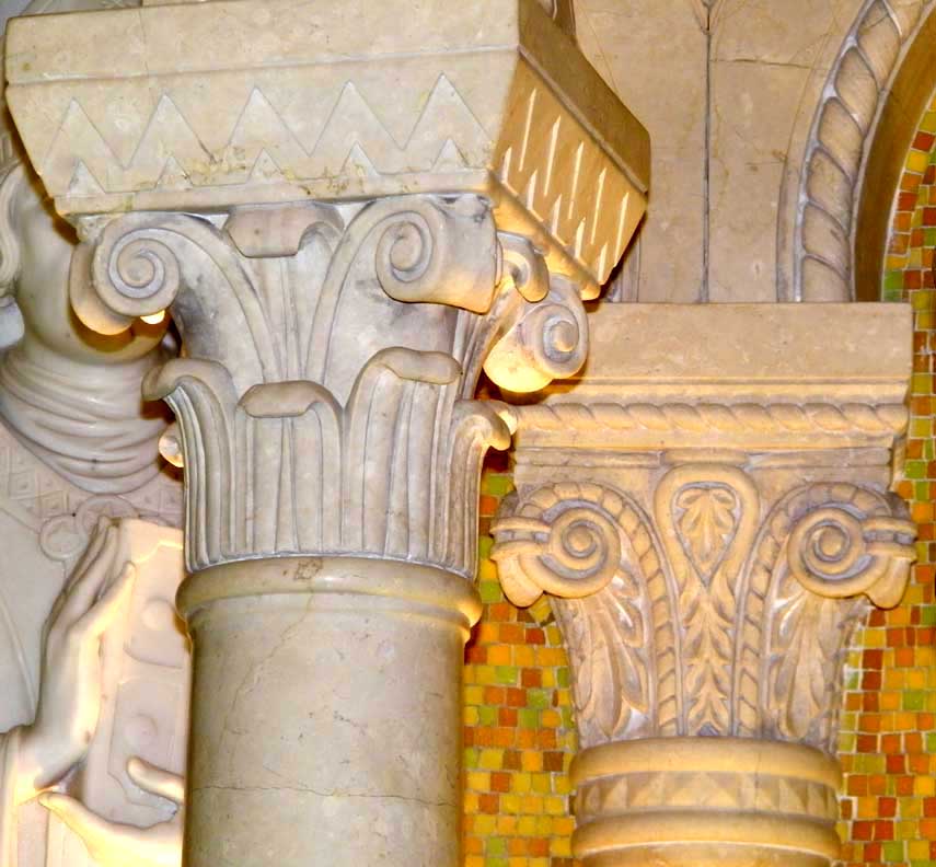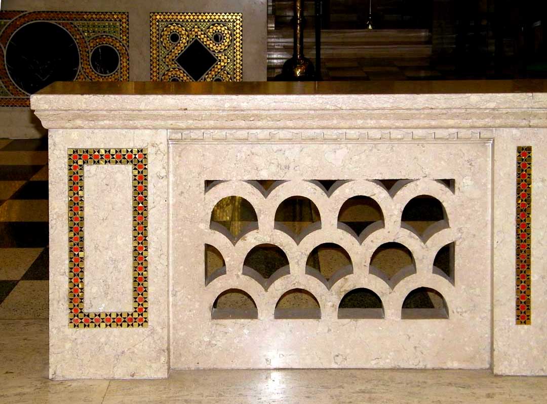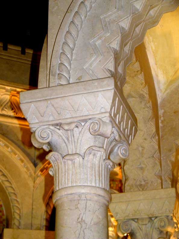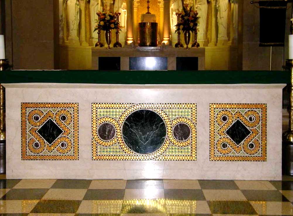 Altar![]() Altar ... Baldachino ... Tabernacle ... Note statues ![]() Baldachino detail #1: ... Leaf-and-dart molding ... Bead-and-reel molding ... Dentil molding ... Rope molding ... Chevron molding ![]() Baldachino detail: #2 ... Rope molding ... Chevron molding ... Volutes and water leaves on capital ![]() Baldachino detail: #3 ... Rope molding ... Chevron molding ... Volutes and water leaves on capital ![]() Three of the Four Evangelists, each carrying a Bible ![]() The Four Evangelists icons decorate the tabernacle ... Four icons detailed below: ![]() St. Matthew the Evangelist (winged man) ![]() St. Mark (winged lion) ![]() St. Luke (winged ox) ![]() St. John (eagle) ![]() Main altar: marble with glass tesserae mosaic inlay ... Two details below: ![]() Main altar glass tesserae mosaic inlay detail #1 ![]() Main altar glass tesserae mosaic inlay detail #2 ![]() Altar rail glass tesserae mosaic inlay |