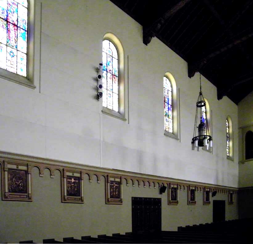 ![]() Nave and sanctuary ... Note clearstory windows in the basilica style building ![]() Clearstory windows ... Stations of the Cross ![]() Note Rambusch Decorating Co. of NY City signature in lower right in the Melchisedech window ... Detail below: ![]() |