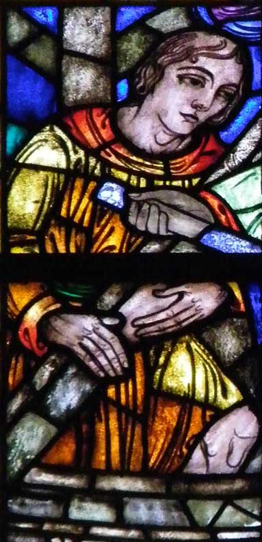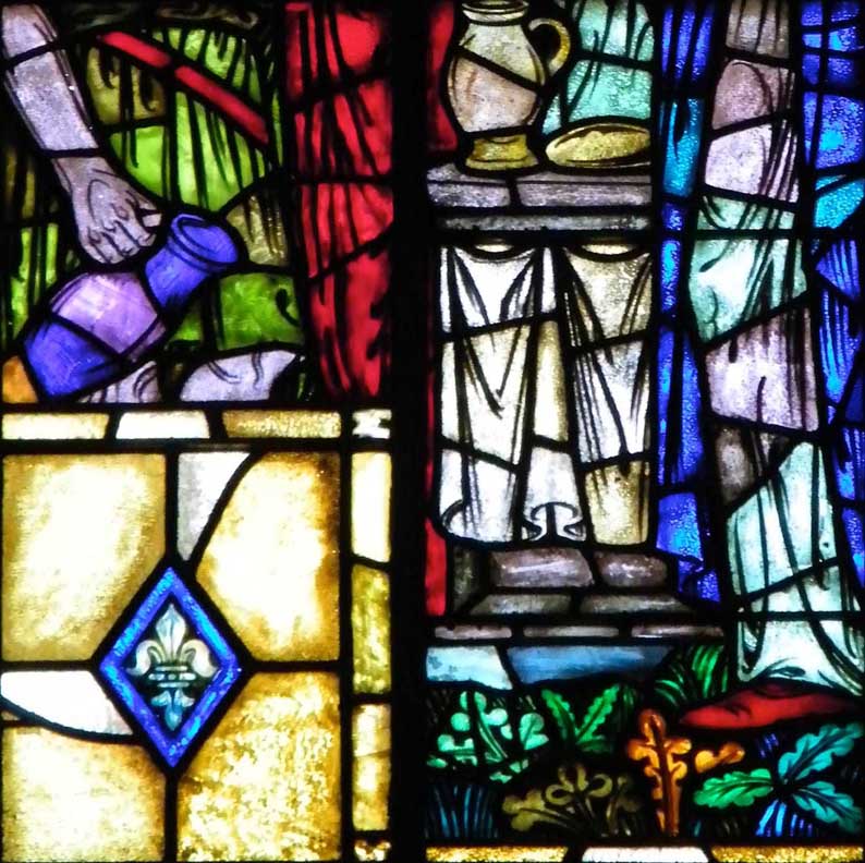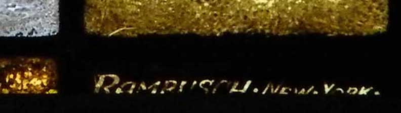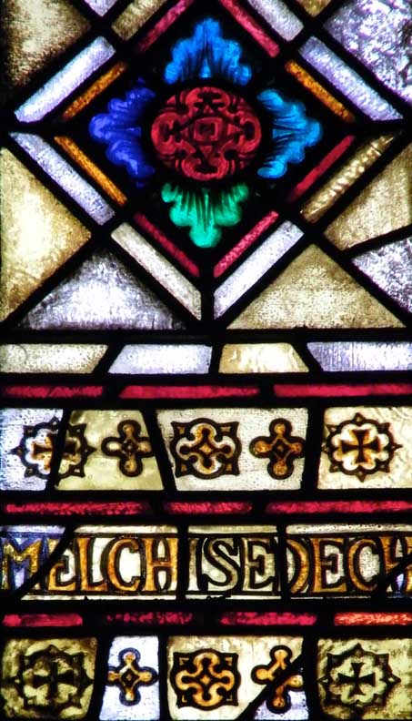 ![]() ![]() ![]() ![]() ![]() Note Rambusch Decorating Co. of NY City signature in lower right in the Melchisedech window ... Detail below: ![]() |