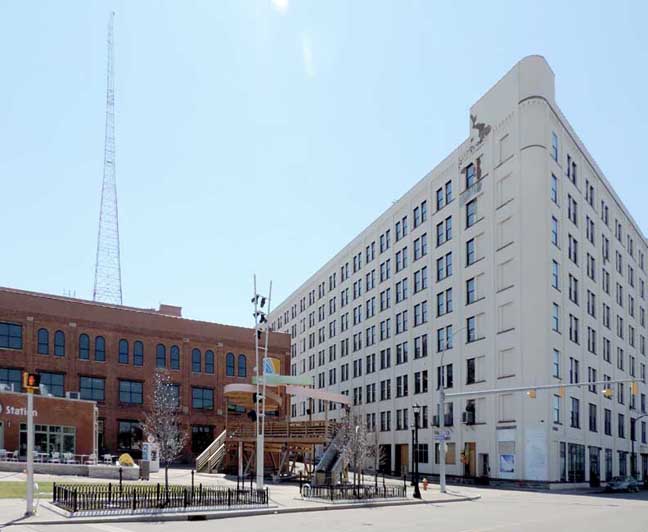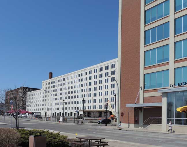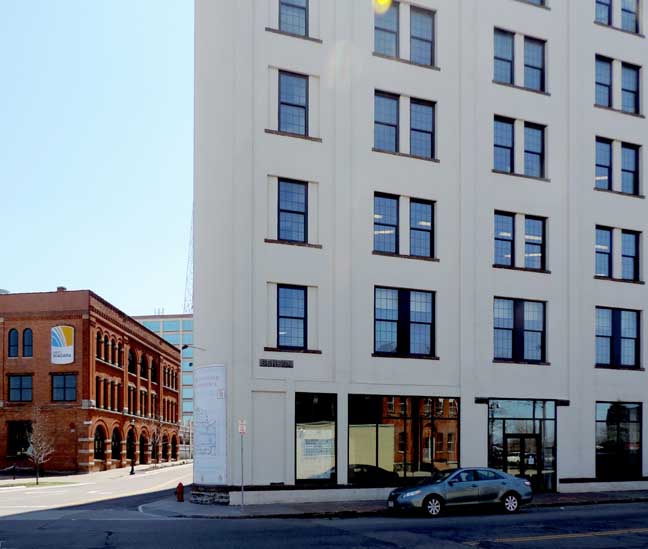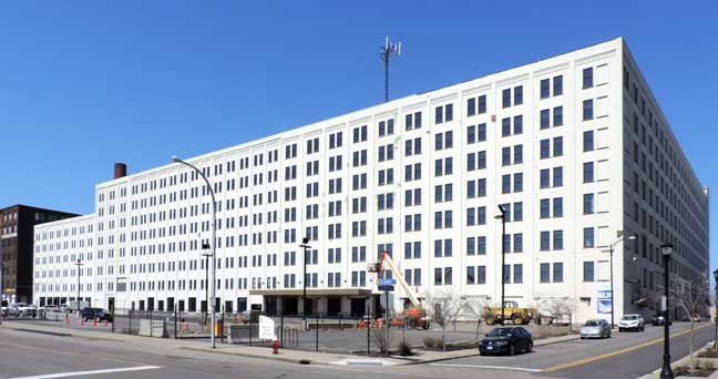 single complex totaling around 1.3 million sq. ft. 701 will be restored to the appearance it was in the 1950s/1960s with a full stucco façade. The main reason for this is due to the associated costs of the stucco removal and the resulting damage to the bricks beneath. When the stucco is removed it leaves multiple two inch holes in the brick and would damage the brick to the point of not being restorable. One of the best improvements that will be made will be the installation of shop windows on the ground floor, as was the historical presence on Seneca Street. -