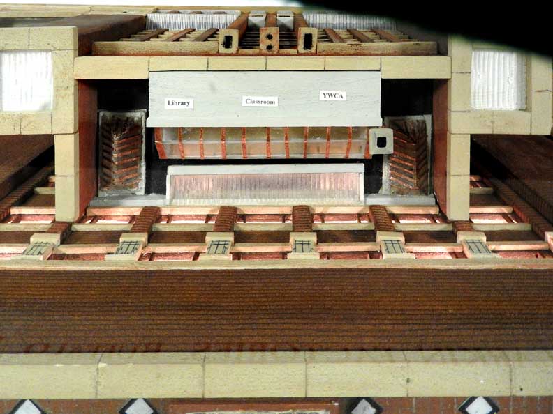 ![]() Arlan Peters ... Frank Lloyd Wright ![]() Facade on Seneca Street - South elevation ![]() Swan Street north elevation ![]() East elevation (facade to the left) ... Electrified model ![]() Top of the building model ... Note the center skylight (detailed in next photo below:) ... Note center bottom main entrance wing (detailed in second photo below:) ![]() Electrified skylight ![]() Electrified wing |