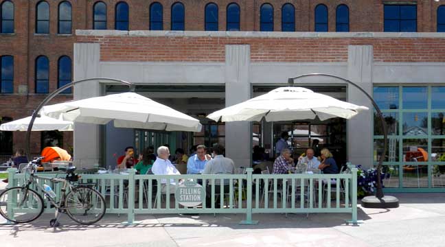The Filling Station was purchased in 2009 by Larkin Development Group who quickly removed the metal panels, thus revealing the original brick and concrete structure. The capitals of the concrete columns display an ‘icicle’ motif, and have been fully restored on the building’s exterior. All the original interior walls were removed and the building has been retrofitted to accommodate a state-of-the-art restaurant.