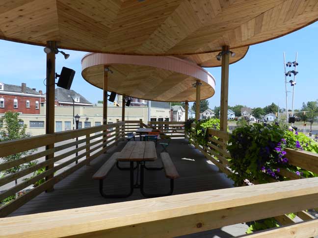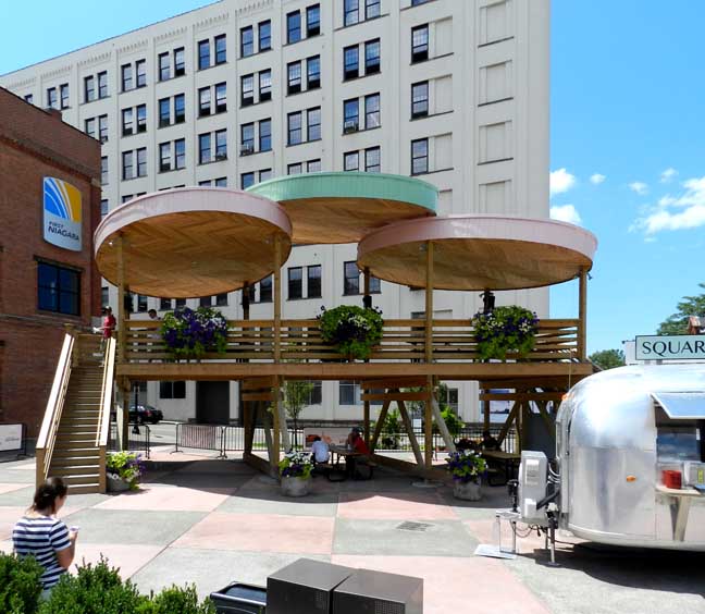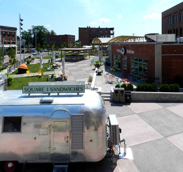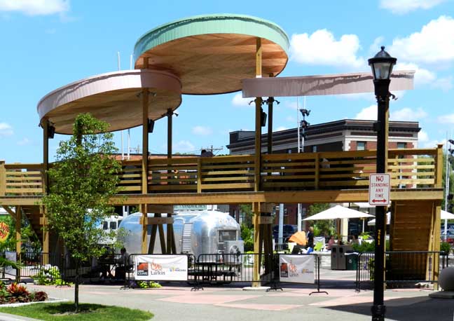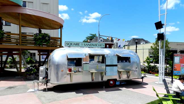 Elevated food court and Square 1 Sandwiches food truck, a converted Airstream Trade Wind Land Yacht