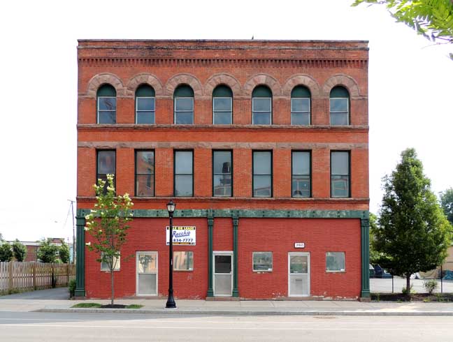 ![]() Two-part mixed use commercial block brick building is 3-stories with a 7-bay primary south facade. The ground floor features brick infill set into the original cast iron store front facade which still retains decorative pilasters at each end of the facade and flanking a central entry door. "Two-part commercial blocks