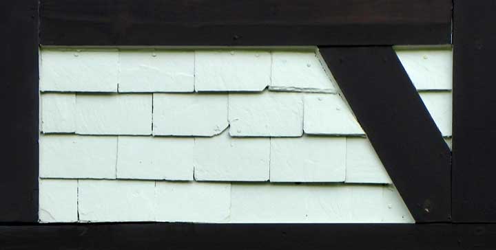![]() Source: Beautiful Homes of Buffalo, 1915, Figuree 8. Note the porch, very different from the one pictured below. ![]() Details, from the top, below: ![]() Brick chimney with corbeling ..... Half-timbering, using painted wooden shingles between the timbers ..... Plain vergeboards ![]() Tripart window ![]() Stone window surround, including lintel, left side Gibbs surround, and sill ![]() ![]() ![]() Half-timbering, using painted wooden shingles between the timbers ![]() ![]() Cushion capitals ![]() ![]() Living ro leaded, beveled glass with reflections of foliage from the front yard trees ![]() Opalescent stained glass ![]() ![]() South and east elevations ![]() ![]() |