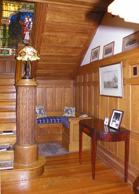 The stained glass window![]() Stained glass window depicts John and Priscilla Alden, passengers on the Mayflower. Their story is depicted in Henry Longfellow's poem , "The Courtship of Miles Standish." 2011 house owner Cutler Green is a descendant. ![]() Cartouche, in center, is flanked by opalescent glass. Leaves above and below are stenciled. ![]() ![]() ![]() ![]() Painted clothing details ![]() ![]() |