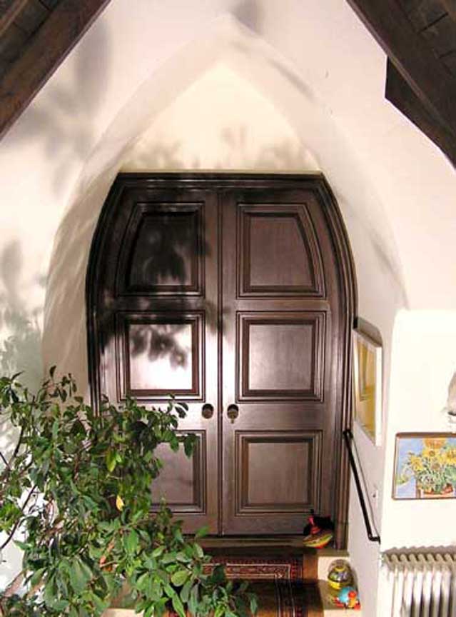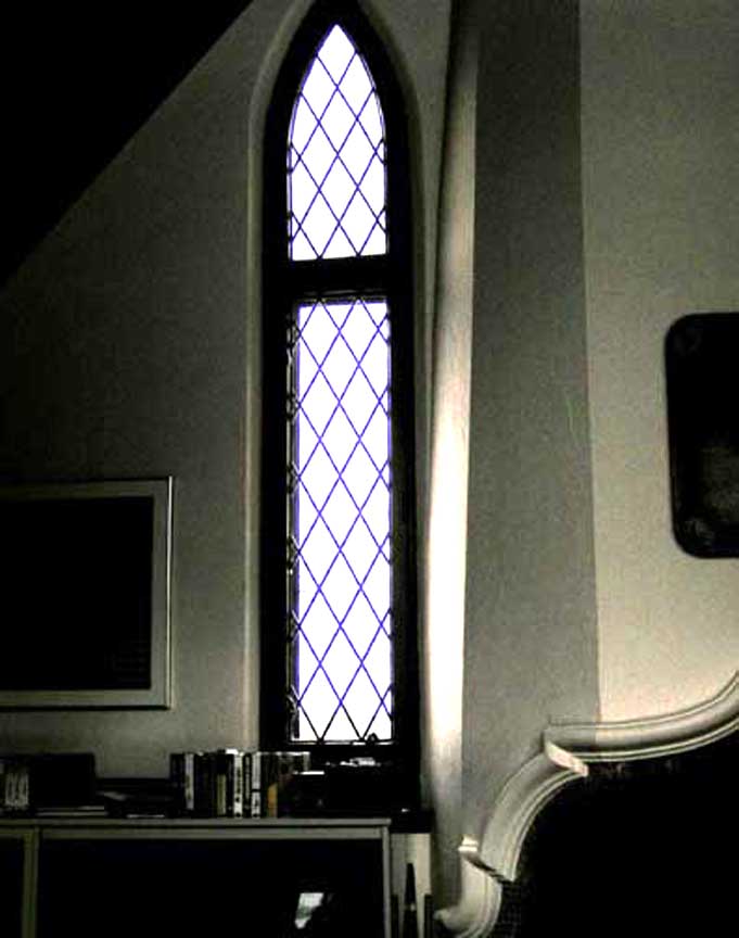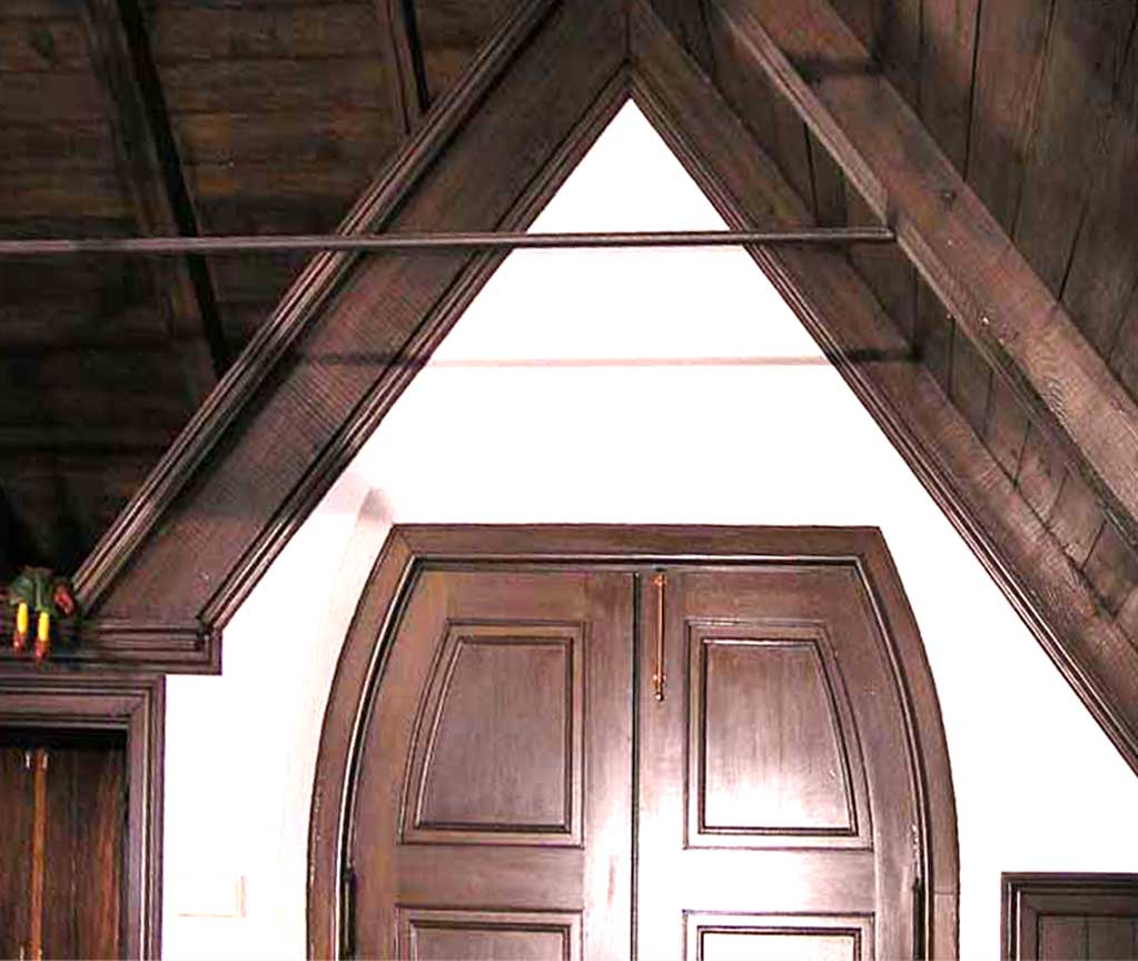 Double doors leading to the "moon room." Note the unusual shape. Further, the tops of the doors seem chopped off. More architect's humor?