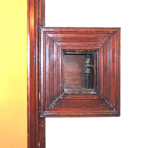 and hallway![]() ![]() Spindle spandrels ![]() ![]() Wooden corner bumper guard (detail below:) ![]() Turned top ![]() Hallway gas turnoff enclosure - closed ![]() Hallway gas turnoff enclosure - open |