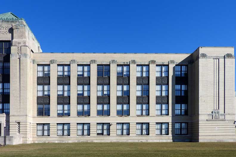 1934-1937. A project of the Federal Emergency Administration of Public Works, the school was a child of the Depression (when Art Deco was popular). |