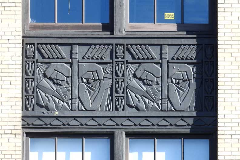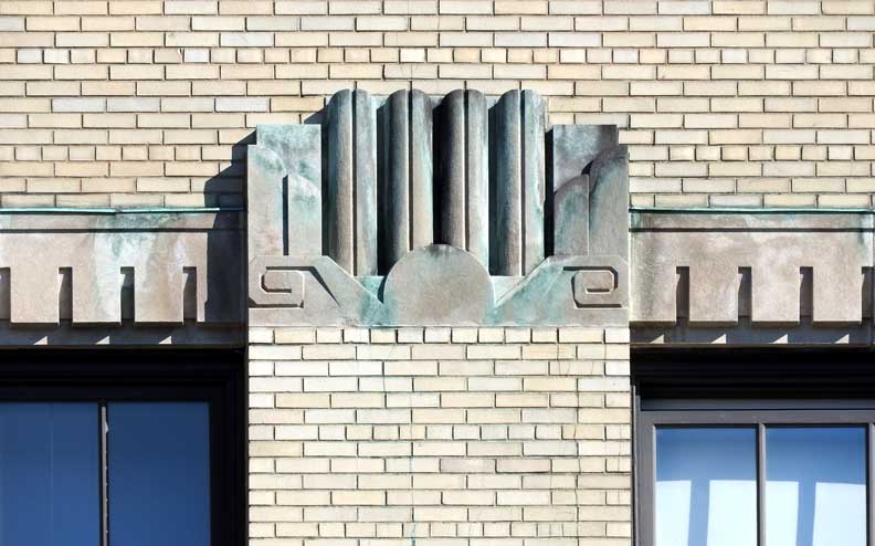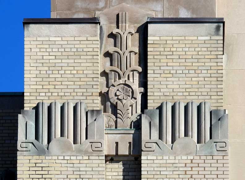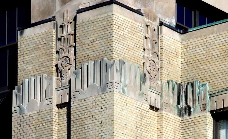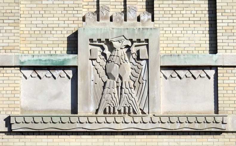 Facade south bays![]() Five details below, starting at top left: ![]() Detail #1 - Fountains ... Flanking sunbursts ![]() Detail #2 - Dentils ... Sunbursts with volutes ![]() Detail #3 - Spandrel panels ... Torches ... Flames ... Chevrons ![]() Detail #4 - Dentils ... American bond brick pattern ![]() Detail #5 - Art Deco stylized eagle ... Chevrons ... Scallops |