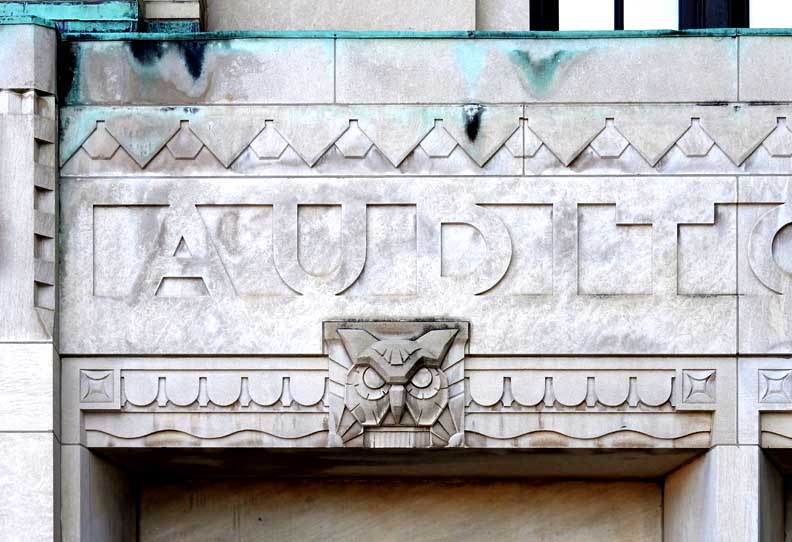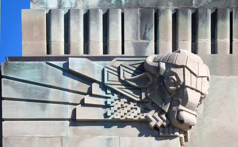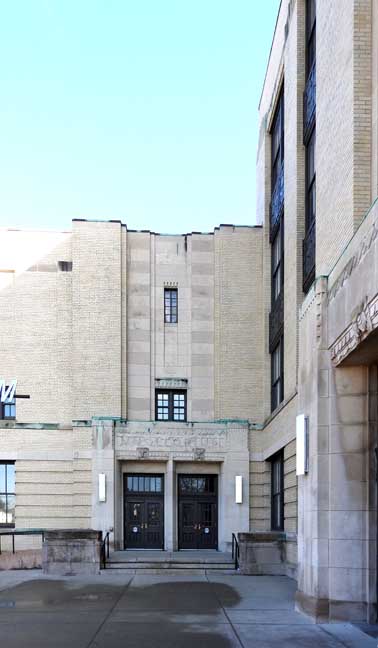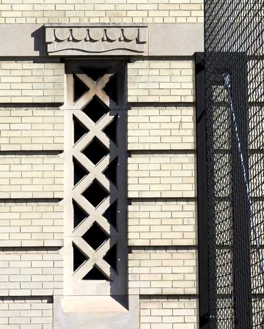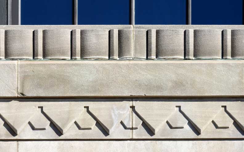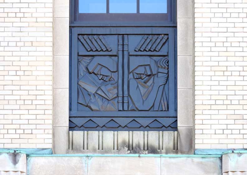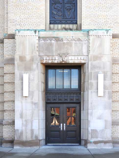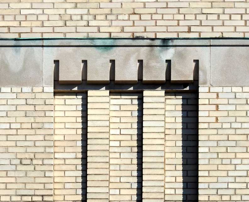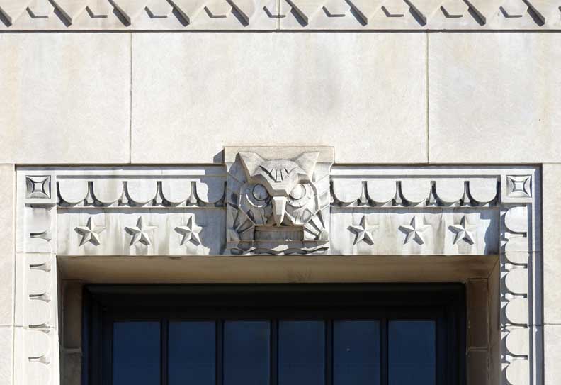 Center bay ![]() Center bay ... Details below from the top down: ![]() Center bay ... Copper roof ... Art Deco lettering and geometric ornamentation ![]() Reeding ... Art Deco stylized bas-relief bison ... Cf., Market Arcade and Old Post Office/ECC ![]() Center bay ... Common bond brick pattern (headers every 6th row) ... Center fountain ... Flanking sunbursts ![]() Main entrance ... Owl detailed below: ![]() Center bay ... Indiana(?) limestone ... Chevrons ... Scallops ... Owl: Mascot ![]() Art Deco scalloped ornament ![]() Center bay ... Bas-relief ... Reeding ... Chevrons |