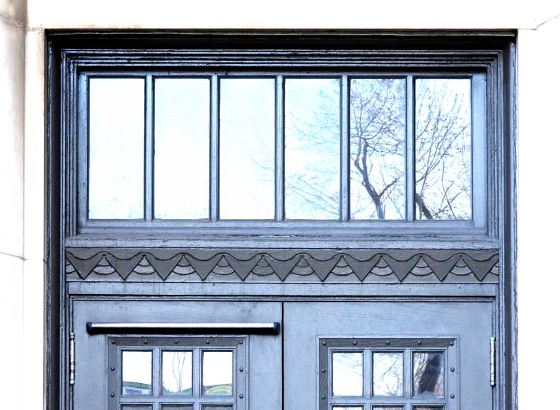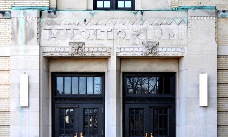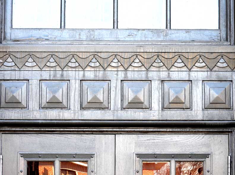 Two northern bays ![]() Auditorium entrance ... Three details below: ![]() Auditorium entrance detail #1 ![]() Auditorium entrance detail #2 - Chevrons ... Art Deco lettering ... Owl ... Scallops ![]() Auditorium entrance detail #3 - Chevrons ![]() North entrance ... Two details below: ![]() North entrance detail #1 - Spandrel panels ![]() North entrance detail #2 - Chevrons |