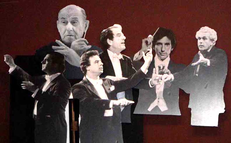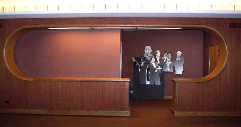 Coat room with cardboard cutouts of Buffalo's Symphonic conductors