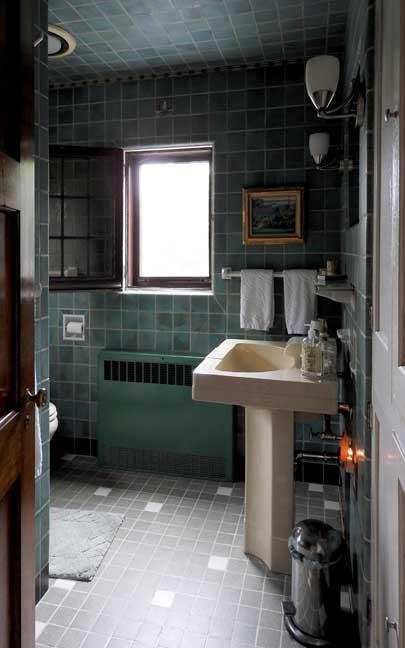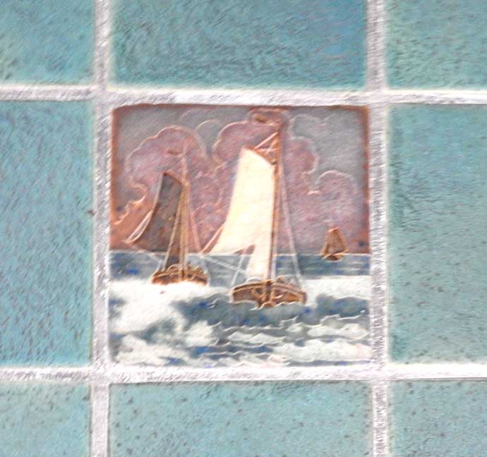 Bathroom 2017 photos ![]() ![]() "Tile in bath is most likely from the Mosaic Tile Co. of Zanesville OH I’m confident that the tiles of boats are Mosaic since it’s their style and sample tiles in a box left in the basement contains tiles from this company. The wall & ceiling tiles are faience." - Sherry Willoughby ![]() "The original owners clearly had a love of boats and the sea. My guess is that they must have traveled extensively." - Barry A. Muskat ![]() Art Deco sink ... This is a rare sink. All original. "Henry Dreyfuss designed Crane "Neuvogue" bathroom fixtures. 1936. Henry Dreyfuss was
