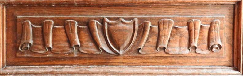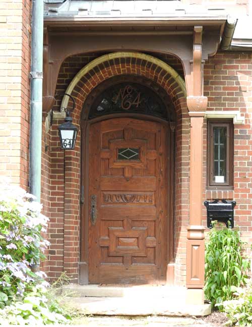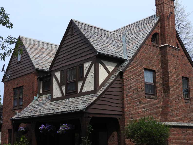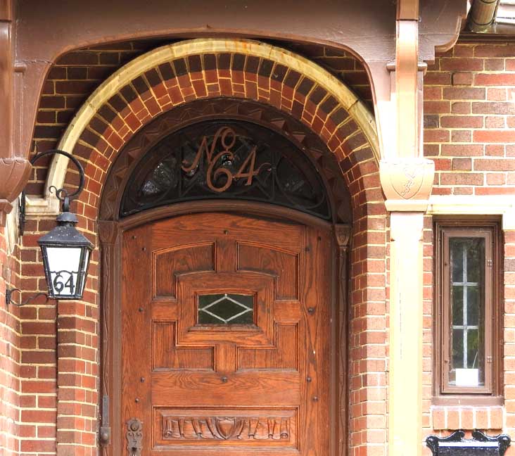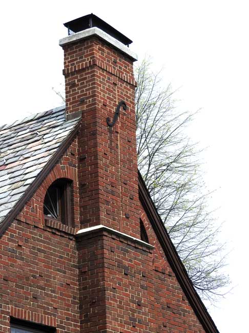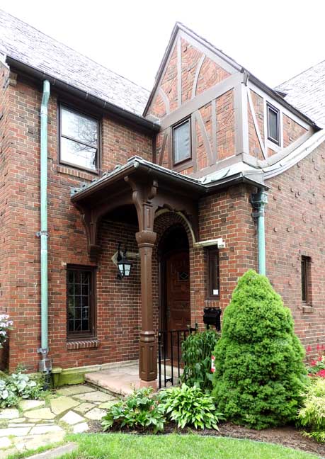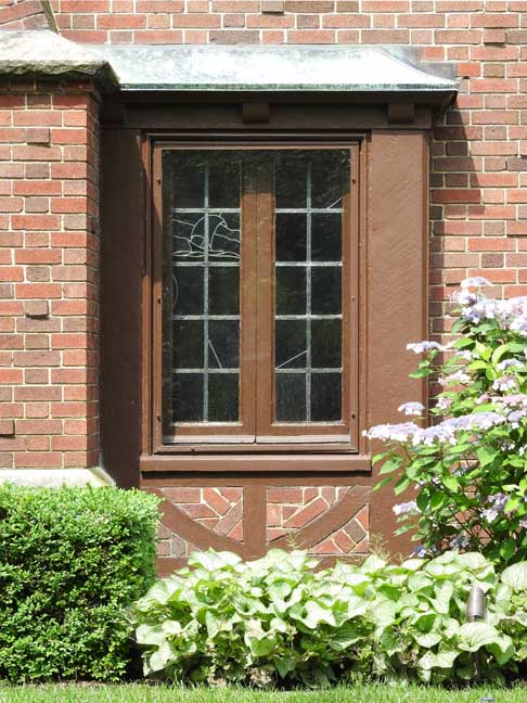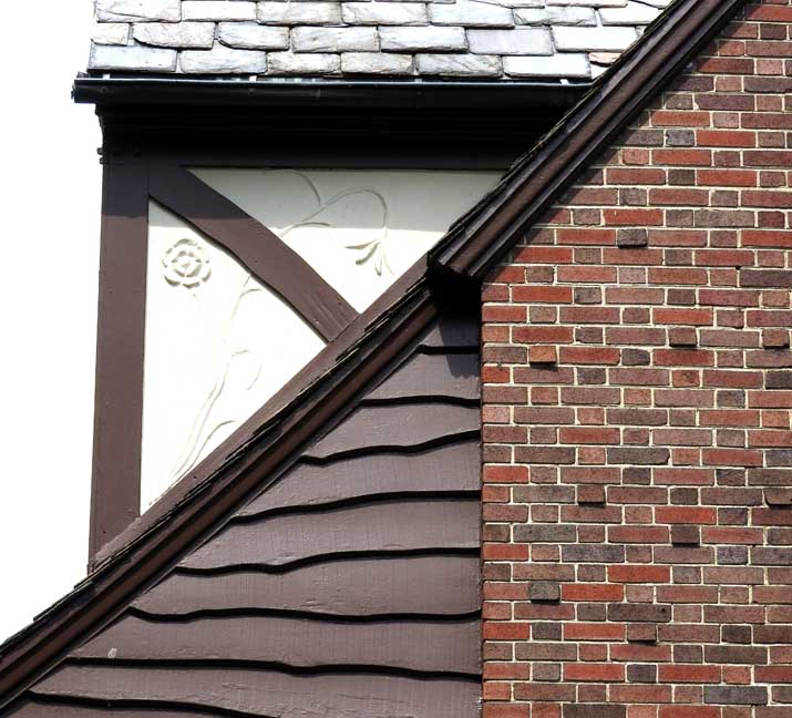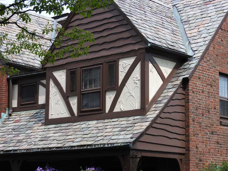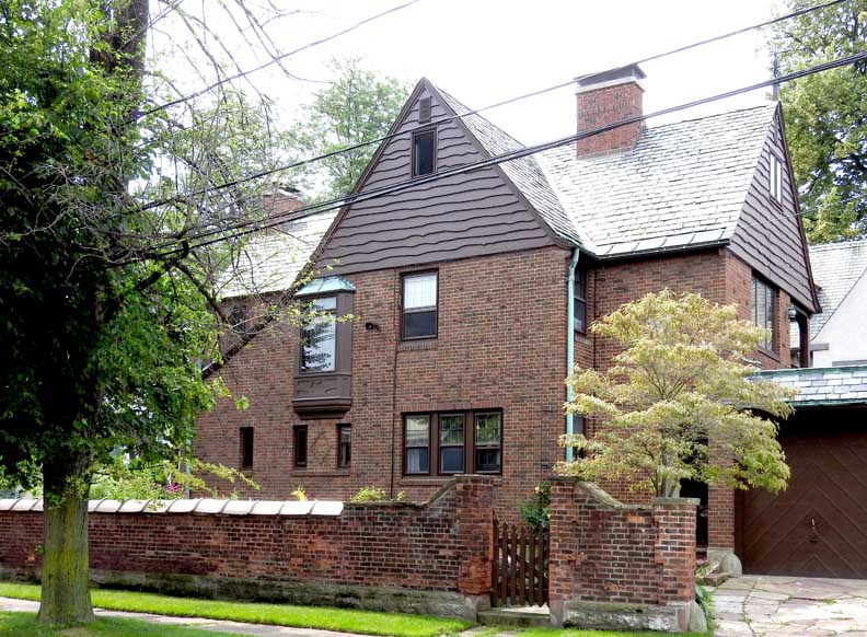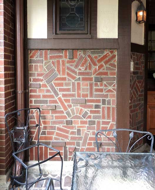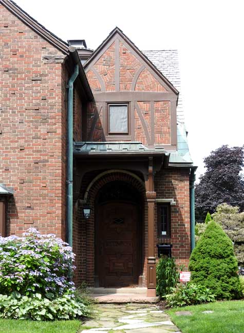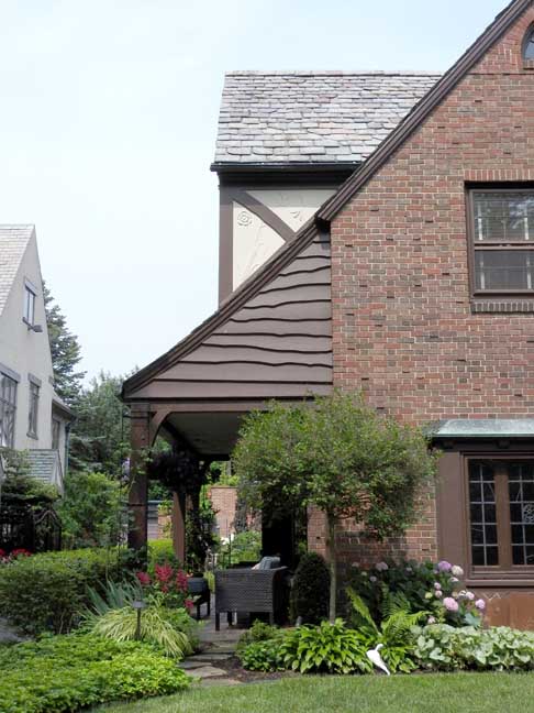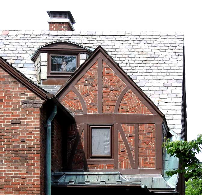 otherwise Facade ![]() Facade ... SW corner of Tudor Place and Cleveland Avenue ... Tudor Revival 2016 photo ![]() Facade ... Note slate roof and decorative header brick motif ... Flemish brick pattern ![]() Facade ... Tie rod anchor ![]() Facade ... Two details below: ![]() Facade ... Detail #1 - Slate roof ![]() Facade ... Detail #2 - Half-timbering with decorated plaster ... Wavy edge clapboards and portruding header bricks both reference Tudor era technology ... Flemish brick pattern ![]() Facade ... Note stained glass and half-timbering ![]() Facade ... Entrance bay ... Seven details below: ![]() Facade ... Detail #1 - Slate-sided dormer ... Half-timbering ![]() Facade ... Detail #2 - Slate-sided dormer ![]() Facade ... Detail #3 - Portico ![]() Detail #3 - Tudor Revival portico ![]() Facade ... Detail #4 - Hoodmold with label stops over transom light and strapwork-decorated door ![]() Facade ... Detail #5 - Linenfiold decoration on front door ![]() Facade ... Detail #5 - Original lantern ![]() Facade ... Detail #6 ![]() Facade ... Detail #7 - Scroll-sawn board ... Flemish brick pattern ![]() "The lot is framed along its north border by the brick wall from the original Albright estate. (Neighborhood walkers know that it matches the wall on West Ferry, delineating the enormous perimeter of the original estate.) That wall with its camel-back top was intact, but the owners rebuilt a stacked-stone wall on Tudor Place [at the far right of this photo] and a brick wall in their rear courtyard. The three-car, slate-roofed garage is original and faces Cleveland Avenue." - Barry A. Muskat |