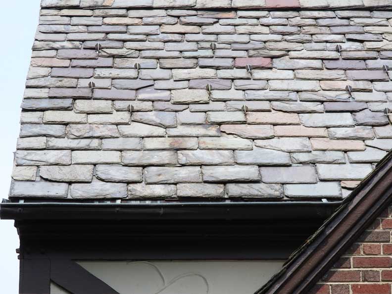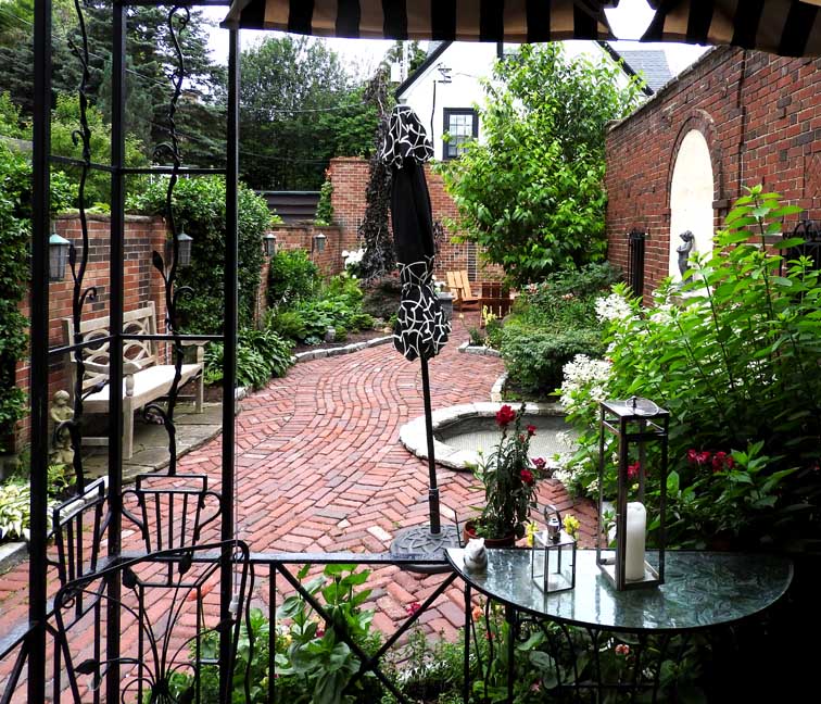 and a brick wall in their rear courtyard. The three-car, slate-roofed