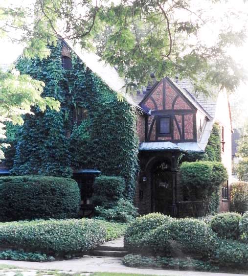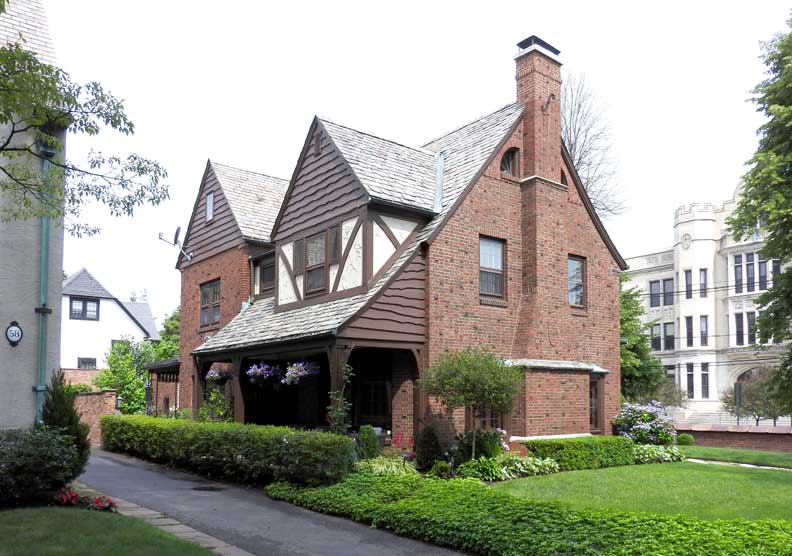 2017 photos![]() SE elevations ... Nardin Academy across the street on Cleveland Avenue ... Two house details below: ![]() Detail #1 - Cross gable roofs ... Wavy edge clapboards ... Half-timbering ![]() Detail #2 - Half-timbering with decorated stucco ... Stucco: cf., Ullmann House |