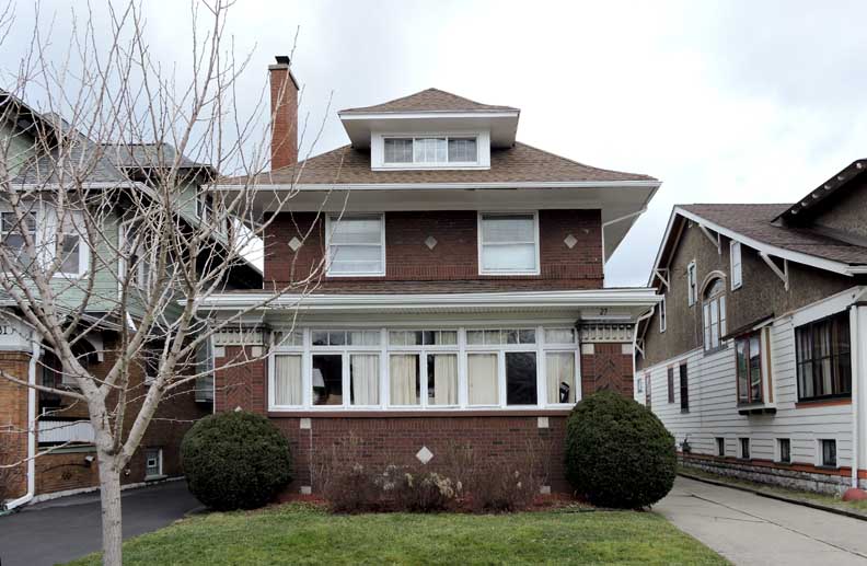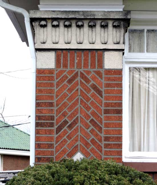 27 University Avenue ![]() 27 University Avenue ... Built 1928 ... Hipped roof ![]() 27 University Avenue ... Dormer clipped gable roof ![]() 27 University Avenue ... Square column with capital decorated with leaves and center panel using herringbone pattern ![]() 27 University Avenue ... Capital decorated with leaves |