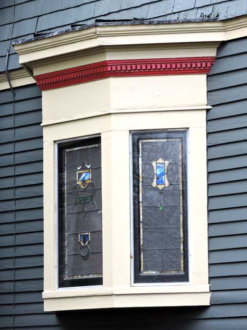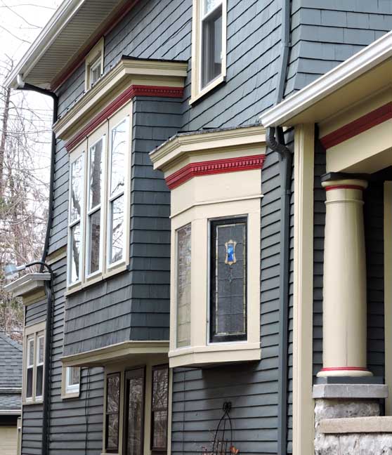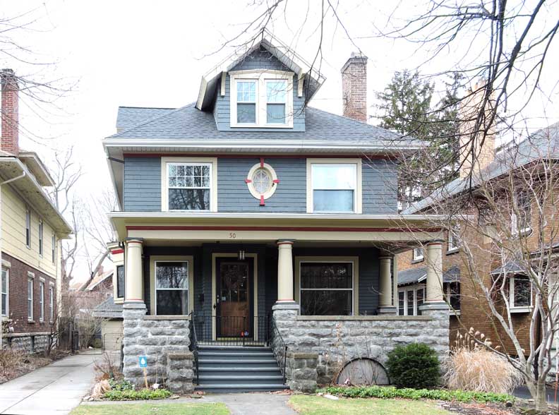 50 University Avenue ![]() 50 University Avenue ... Built c. 1915 ... Colonial/Craftsman styles ... Hipped roof ... Gable roof dormers with Craftsman style supports ... Colonial oval window ... Tuscan columns ![]() 50 University Avenue ... Craftsman style supporting bracket ![]() 50 University Avenue ... Colonial oval window with spiderweb muntins ![]() 50 University Avenue ... Colonial oriel window ![]() 50 University Avenue ... Colonial oriel window with opalescent glass accent ![]() 50 University Avenue ... Tuscan column |