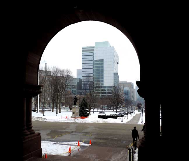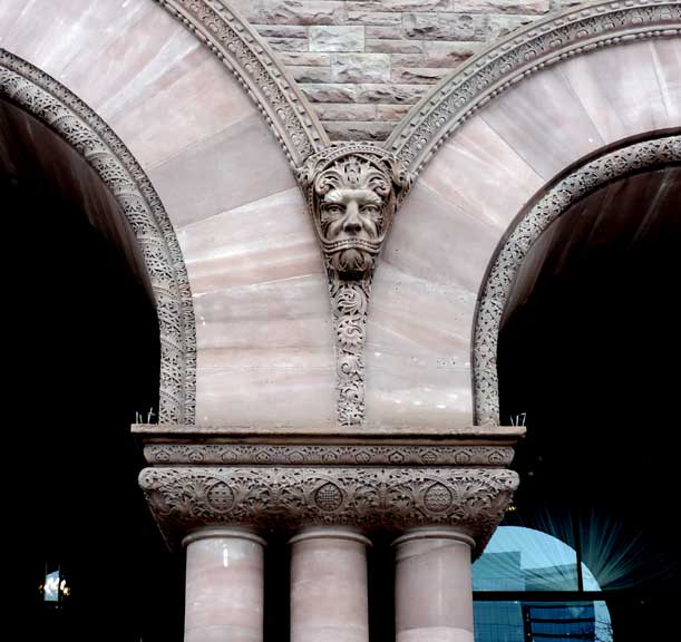 February 2014 Facade Photos![]() Richardsonian Romanesque style ... To the south of the Legislative Building is an open area with extensive tree cover, which is often used for public gatherings and demonstrations. ![]() The present Ontario Legislative Building is the seventh such structure to serve as Ontario's parliament building. The second building, in York (Toronto), was burned by the Americans during the War of 1812. ![]() "... centre of the building, and is lit by the three large and prominent arched windows above the main portico. This block is flanked by two domed towers, the west of which was originally intended to hold a clock, but was fitted with a rose window instead, after funds for the clock were never amassed." - Wikipedia (online April 2014) ![]() Torch ... Slate roof ![]() "... three large and prominent arched windows above the main portico." Note center medallion near top (detailed below:) ![]() Medallion: Ontario seal flanked by bas relief allegorical (The representation of abstract ideas or principles by characters, figures, or events in narrative, dramatic, or pictorial form) figures ![]() Portico features three large Richardsonian Romanesque arched portals ![]() Prominent voussoirs, squat columns, carved figural and foliated ornamentation. 4 details below: ![]() #1 of four details ![]() #2 of four details: Grotesque - part human, part animal ![]() #3 of four details ![]() #4 of four details - Gargoyle ... Scrolling acanthus leaves ![]() Gargoyle ... Scrolling acanthus leaves ![]() Billet molding ... Bead-and-reel molding ![]() ![]() ![]() ![]() ![]() ![]() Looking out onto Queen's Park and beyond |