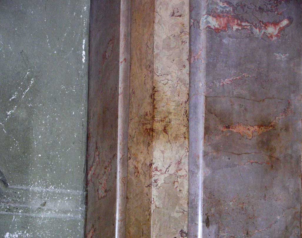 marble wall treatment contrasts with the gray plaster on left
